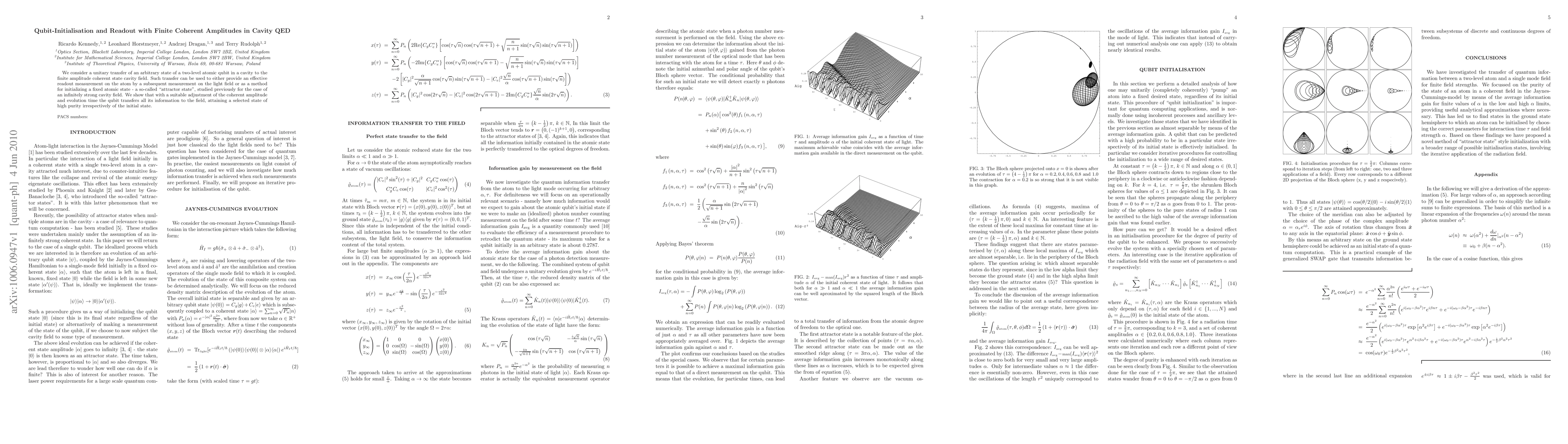 This paper explores the unitary transfer of a two-level atomic qubit's state into a finite coherent amplitude cavity field, enabling effective readout via light field measurement or initialization to an attractor state. The authors demonstrate that precise control over coherent amplitude and evolution time allows the qubit to transfer all information to the field, achieving a high-purity state regardless of the initial qubit state.
