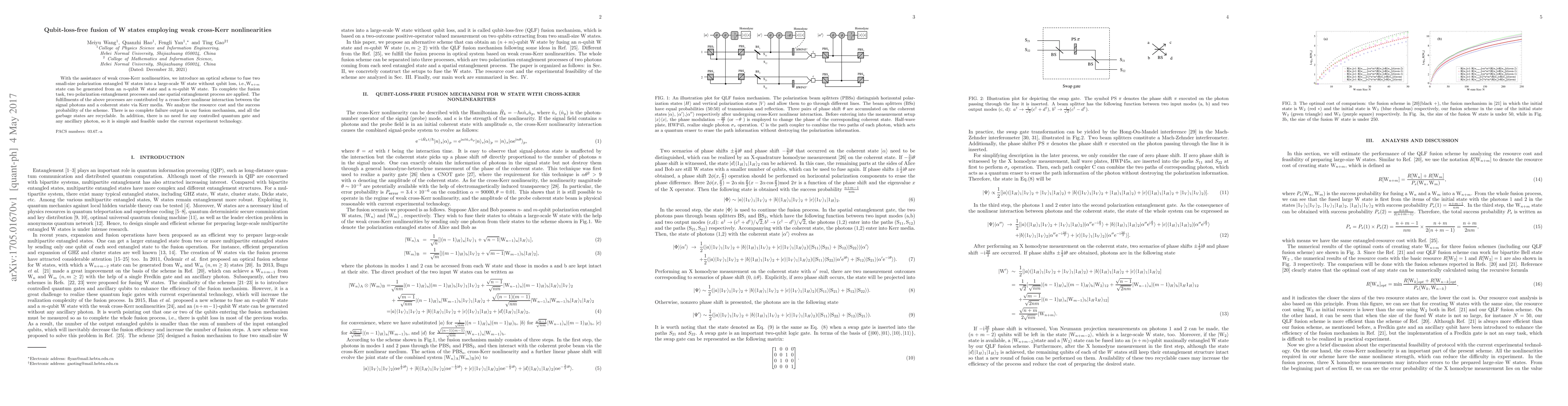 This paper proposes a method for fusing two small-size W states into a larger W state without qubit loss using weak cross-Kerr nonlinearities. The scheme involves polarization and spatial entanglement processes without requiring controlled quantum gates or ancillary photons, making it simple and feasible for current experimental technology.