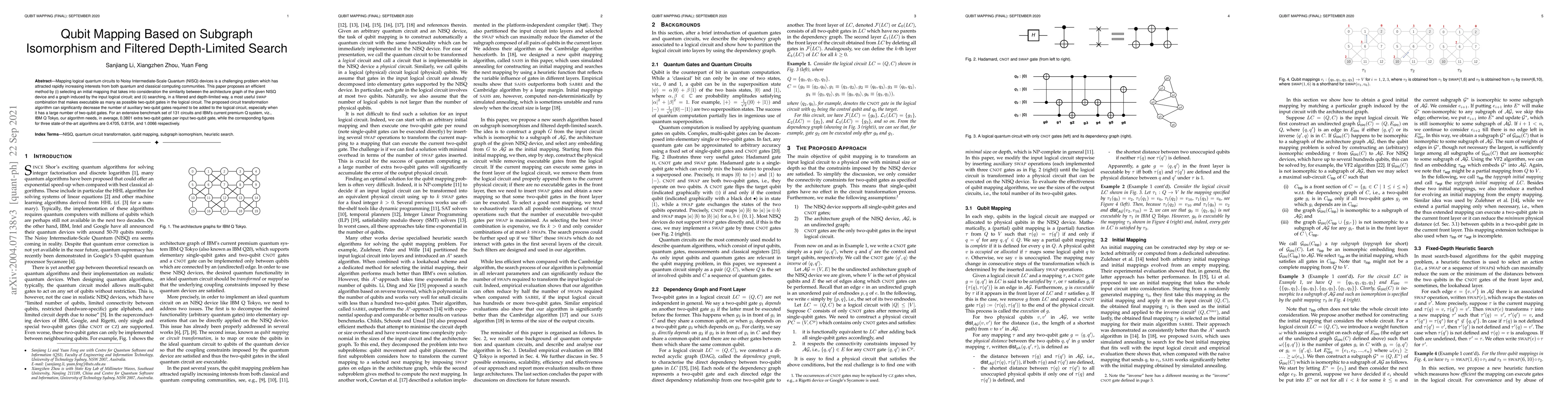 This paper proposes an efficient qubit mapping method for logical quantum circuits on NISQ devices, utilizing subgraph isomorphism and filtered depth-limited search to optimize gate execution. The algorithm significantly reduces the number of auxiliary two-qubit gates, achieving better performance than three state-of-the-art methods.