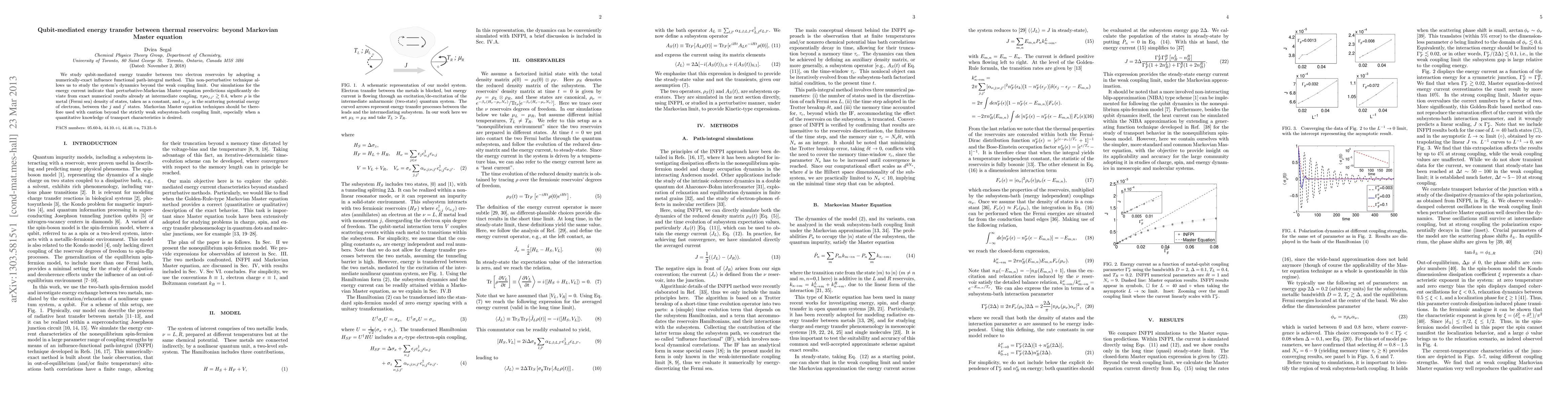 We study qubit-mediated energy transfer between two electron reservoirs by adopting a numerically-exact influence functional path-integral method. This non-perturbative technique allows us to study the system's dynamics beyond the weak coupling limit. Our simulations for the energy current indicate that perturbative-Markovian Master equation predictions significantly deviate from exact numerical results already at intermediate coupling, $\pi \rho \alpha_{j,j'}\gtrsim 0.4$, where $\rho$ is the metal (Fermi sea) density of states, taken as a constant, and $\alpha_{j,j'}$ is the scattering potential energy of electrons, between the $j$ and $j'$ states. Markovian Master equation techniques should be therefore used with caution beyond the strictly weak subsystem-bath coupling limit, especially when a quantitative knowledge of transport characteristics is desired.