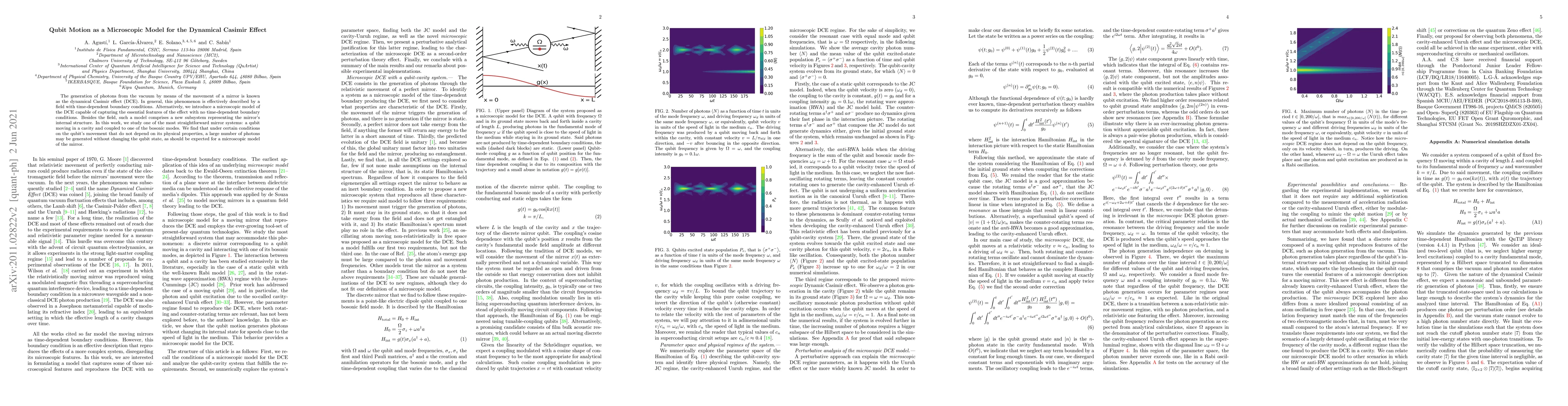 This paper explores a microscopic model for the dynamical Casimir effect using a qubit moving in a cavity, demonstrating photon generation from vacuum without time-dependent boundary conditions, and showing that the qubit's state remains unchanged under specific movement conditions.