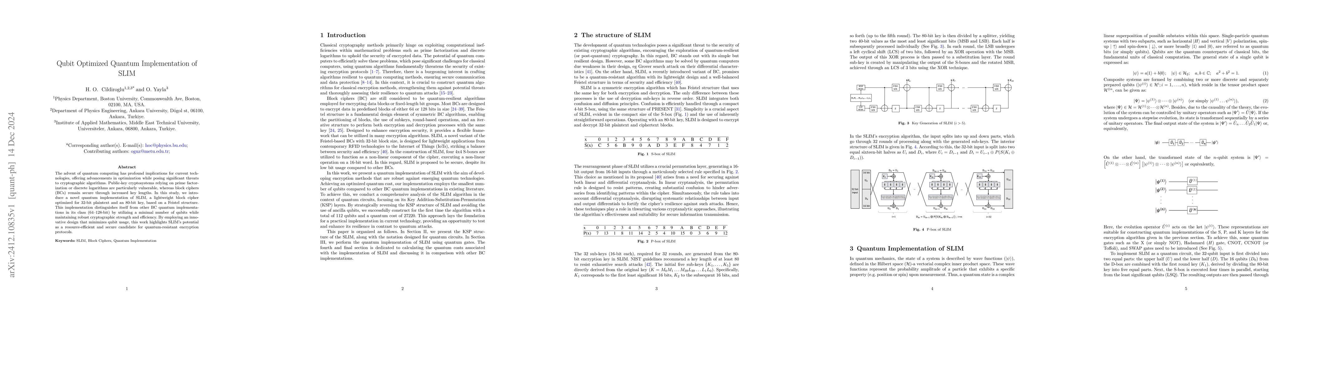 This research introduces a quantum implementation of SLIM, a lightweight 32-bit block cipher with an 80-bit key, optimized to use fewer qubits than comparable implementations. It emphasizes SLIM’s potential for secure, resource-efficient quantum-resistant encryption.