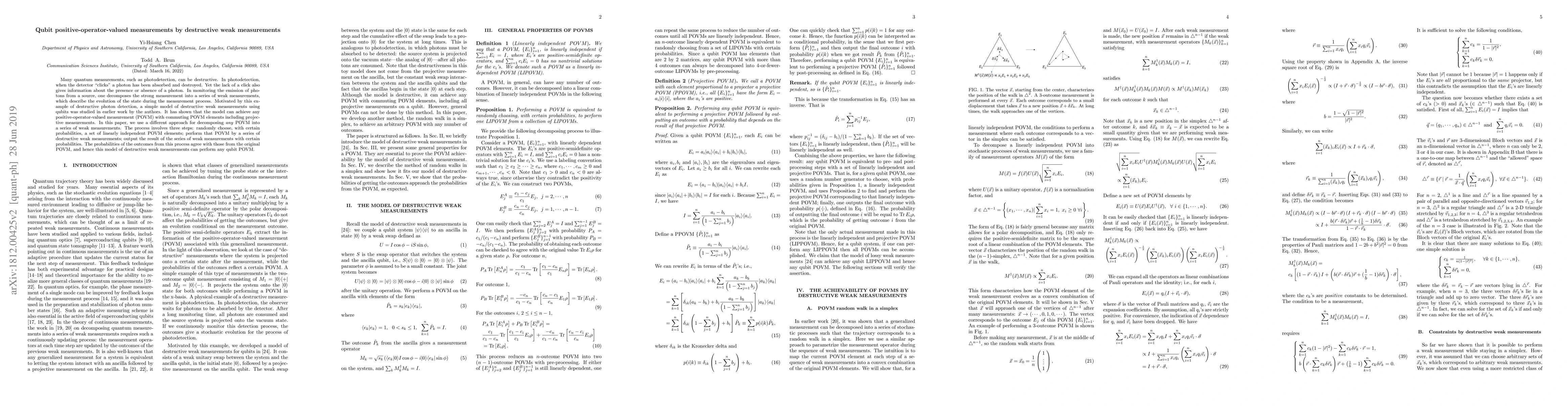 The paper presents a model of destructive weak measurements for qubits, decomposing any Positive-Operator Valued Measurement (POVM) into a series of such measurements. This involves choosing linearly independent POVM elements, performing them via destructive weak measurements, and outputting the result with certain probabilities, ensuring the outcome probabilities match the original POVM.