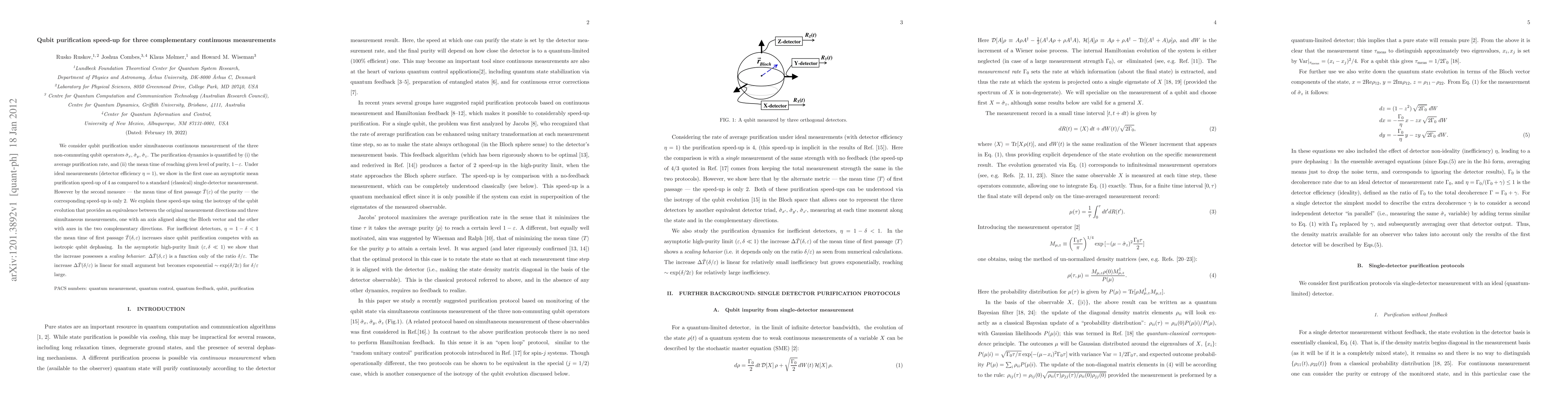 We consider qubit purification under simultaneous continuous measurement of the three non-commuting qubit operators \sigma_x, \sigma_y, \sigma_z. The purification dynamics is quantified by (i) the average purification rate, and (ii) the mean time of reaching given level of purity, (1-\epsilon). Under ideal measurements (detector efficiency \eta=1), we show in the first case an asymptotic mean purification speed-up of 4 as compared to a standard (classical) single-detector measurement. However by the second measure --- the mean time of first passage T(\epsilon) of the purity --- the corresponding speed-up is only 2. We explain these speed-ups using the isotropy of the qubit evolution that provides an equivalence between the original measurement directions and three simultaneous measurements, one with an axis aligned along the Bloch vector and the other with axes in the two complementary directions. For inefficient detectors, \eta=1-\delta <1 the mean time of first passage T(\delta,\epsilon) increases since qubit purification competes with an isotropic qubit dephasing. In the asymptotic high-purity limit (\epsilon, \delta << 1) we show that the increase possesses a scaling behavior: \Delta T(\delta,\epsilon) is a function only of the ratio {\delta}/{\epsilon}. The increase \Delta T({\delta}/{\epsilon}) is linear for small argument but becomes exponential ~ exp({\delta}/2{\epsilon}) for {\delta}/{\epsilon} large.