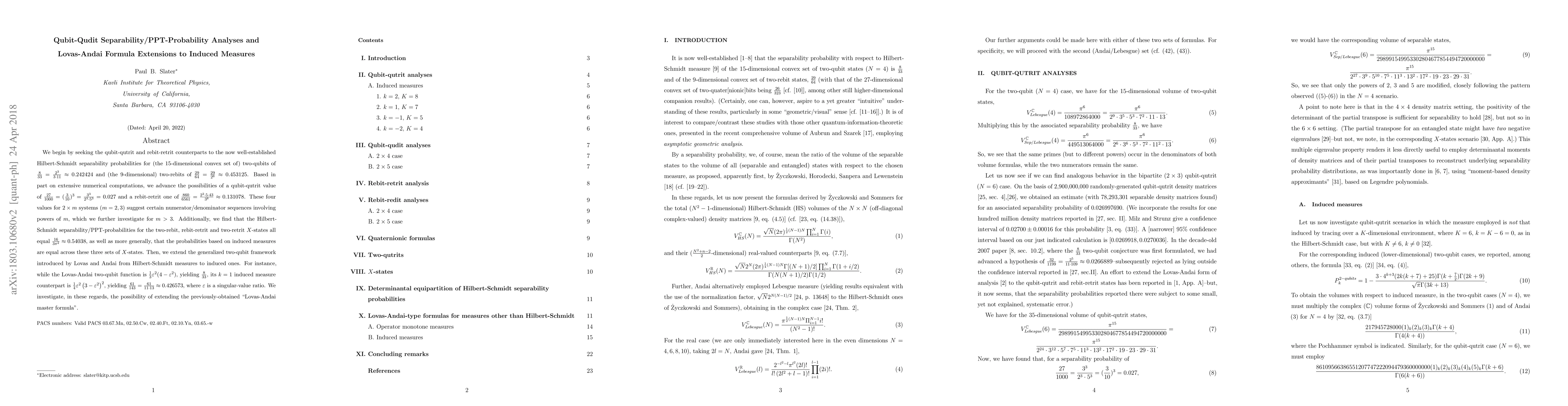 We begin by seeking the qubit-qutrit and rebit-retrit counterparts to the now well-established Hilbert-Schmidt separability probabilities for (the 15-dimensional convex set of) two-qubits of $\frac{8}{33} = \frac{2^3}{3 \cdot 11} \approx 0.242424$ and (the 9-dimensional) two-rebits of $\frac{29}{64} =\frac{29}{2^6} \approx 0.453125$. Based in part on extensive numerical computations, we advance the possibilities of a qubit-qutrit value of $\frac{27}{1000} = (\frac{3}{10})^3 =\frac{3^3}{2^3 \cdot 5^3} = 0.027$ and a rebit-retrit one of $\frac{860}{6561} =\frac{2^2 \cdot 5 \cdot 43}{3^8} \approx 0.131078$. These four values for $2 \times m$ systems ($m=2,3$) suggest certain numerator/denominator sequences involving powers of $m$, which we further investigate for $m>3$. Additionally, we find that the Hilbert-Schmidt separability/PPT-probabilities for the two-rebit, rebit-retrit and two-retrit $X$-states all equal $\frac{16}{3 \pi^2} \approx 0.54038$, as well as more generally, that the probabilities based on induced measures are equal across these three sets of $X$-states. Then, we extend the generalized two-qubit framework introduced by Lovas and Andai from Hilbert-Schmidt measures to induced ones. For instance, while the Lovas-Andai two-qubit function is $\frac{1}{3} \varepsilon^2 (4 -\varepsilon^2)$, yielding $\frac{8}{33}$, its $k=1$ induced measure counterpart is $\frac{1}{4} \varepsilon ^2 \left(3-\varepsilon ^2\right)^2$, yielding $\frac{61}{143} =\frac{61}{11 \cdot 13} \approx 0.426573$, where $\varepsilon$ is a singular-value ratio. We investigate, in these regards, the possibility of extending the previously-obtained "Lovas-Andai master formula".