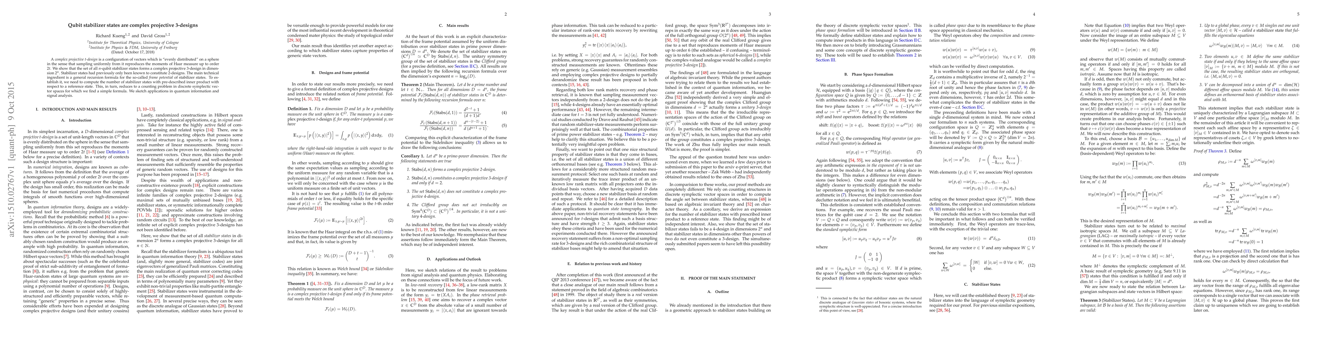 A complex projective $t$-design is a configuration of vectors which is ``evenly distributed'' on a sphere in the sense that sampling uniformly from it reproduces the moments of Haar measure up to order $2t$. We show that the set of all $n$-qubit stabilizer states forms a complex projective $3$-design in dimension $2^n$. Stabilizer states had previously only been known to constitute $2$-designs. The main technical ingredient is a general recursion formula for the so-called frame potential of stabilizer states. To establish it, we need to compute the number of stabilizer states with pre-described inner product with respect to a reference state. This, in turn, reduces to a counting problem in discrete symplectic vector spaces for which we find a simple formula. We sketch applications in quantum information and signal analysis.