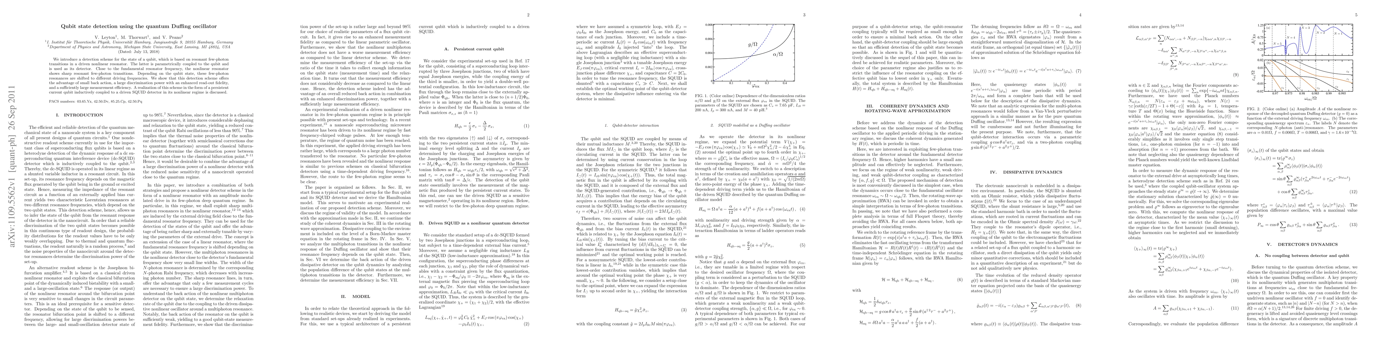 We introduce a detection scheme for the state of a qubit, which is based on resonant few-photon transitions in a driven nonlinear resonator. The latter is parametrically coupled to the qubit and is used as its detector. Close to the fundamental resonator frequency, the nonlinear resonator shows sharp resonant few-photon transitions. Depending on the qubit state, these few-photon resonances are shifted to different driving frequencies. We show that this detection scheme offers the advantage of small back action, a large discrimination power with an enhanced read-out fidelity, and a sufficiently large measurement efficiency. A realization of this scheme in the form of a persistent current qubit inductively coupled to a driven SQUID detector in its nonlinear regime is discussed.