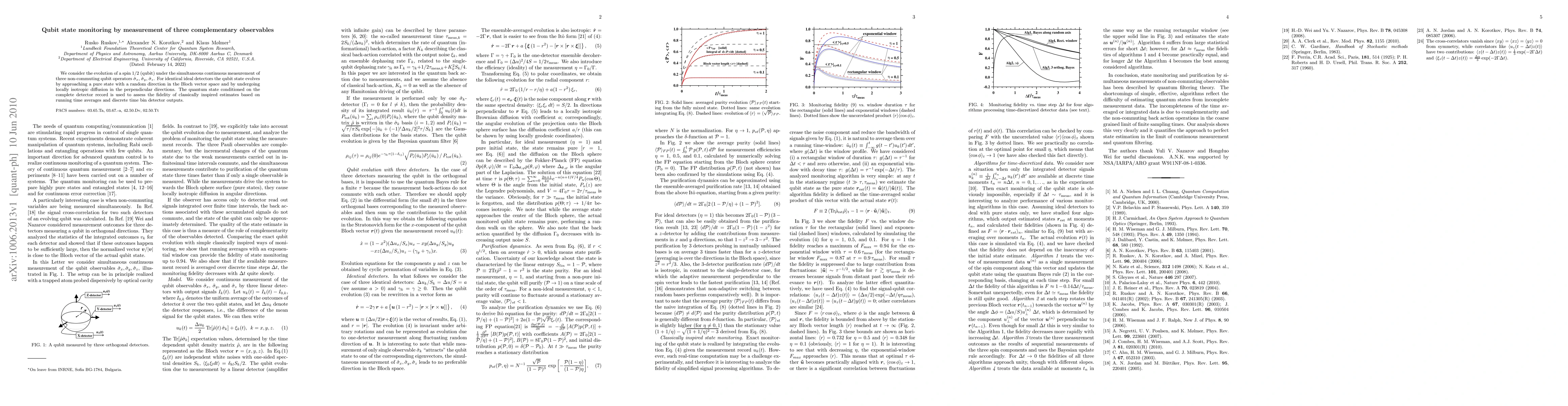 We consider the evolution of a spin 1/2 (qubit) under the simultaneous continuous measurement of three non-commuting qubit operators sigma_x, sigma_y, sigma_z. For identical ideal detectors the qubit state evolves by approaching a pure state with a random direction in the Bloch vector space and by undergoing locally isotropic diffusion in the perpendicular directions. The quantum state conditioned on the complete detector record is used to assess the fidelity of classically inspired estimates based on running time averages and discrete time bin detector outputs.