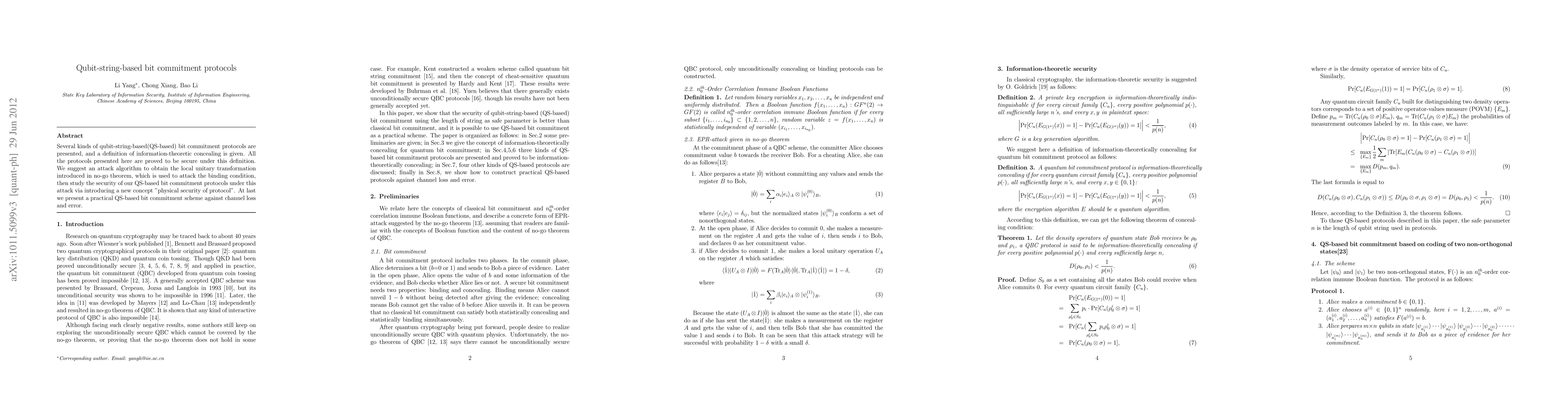 The paper presents several qubit-string-based bit commitment protocols proven secure under information-theoretic concealing, introduces the concept of "physical security of protocol" to address potential attacks, and proposes a practical scheme resilient to channel loss and errors.