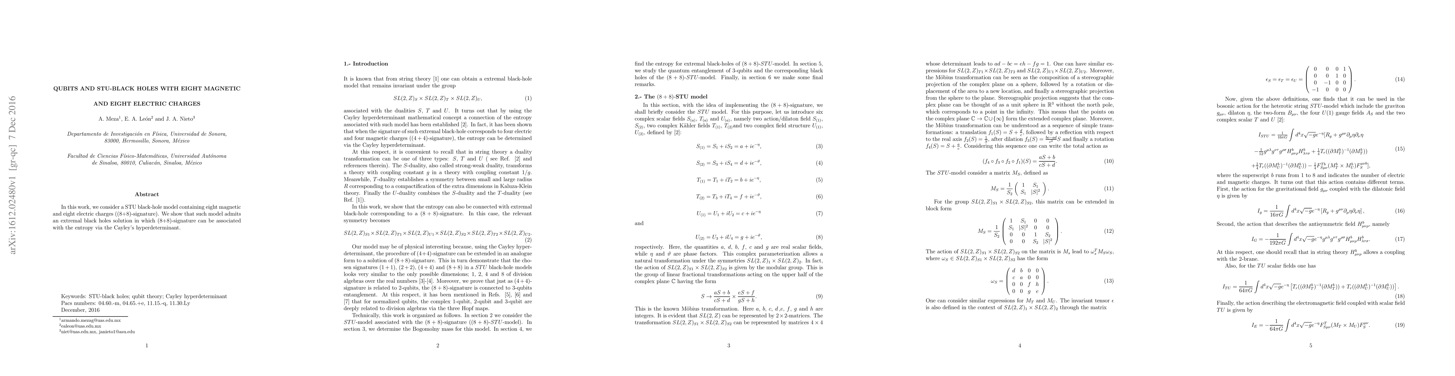 This paper explores a STU black-hole model with eight electric and magnetic charges, demonstrating that it admits an extremal black hole solution where the (8+8)-signature charge configuration can be linked to entropy through Cayley's hyperdeterminant.