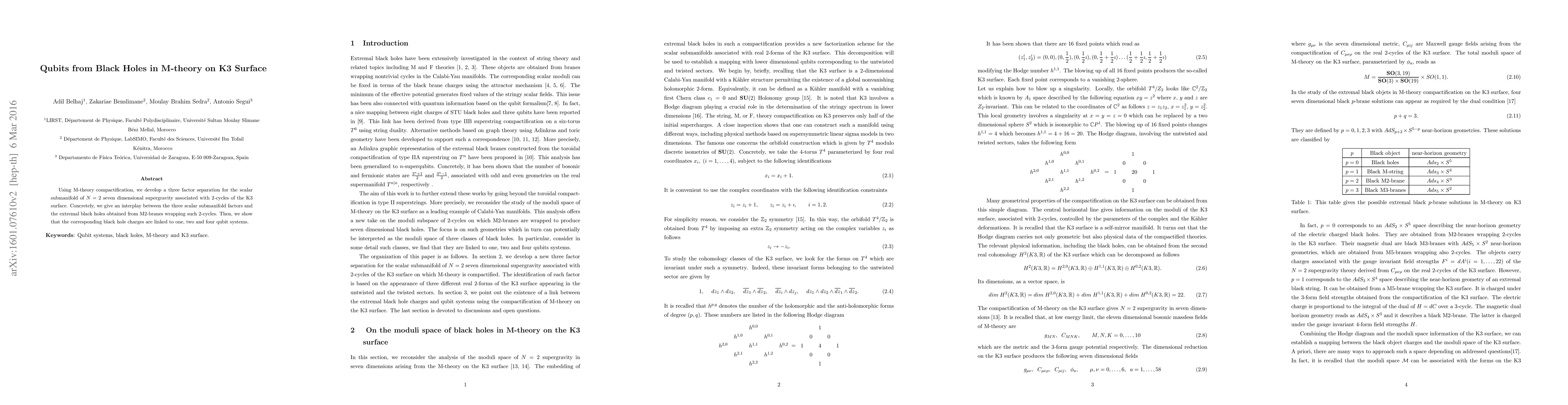 Using M-theory compactification, we develop a three factor separation for the scalar submanifold of N=2 seven dimensional supergravity associated with 2-cycles of the K3 surface. Concretely, we give an interplay between the three scalar submanifold factors and the extremal black holes obtained from M2-branes wrapping such 2-cycles. Then, we show that the corresponding black hole charges are linked to one, two and four qubit systems.