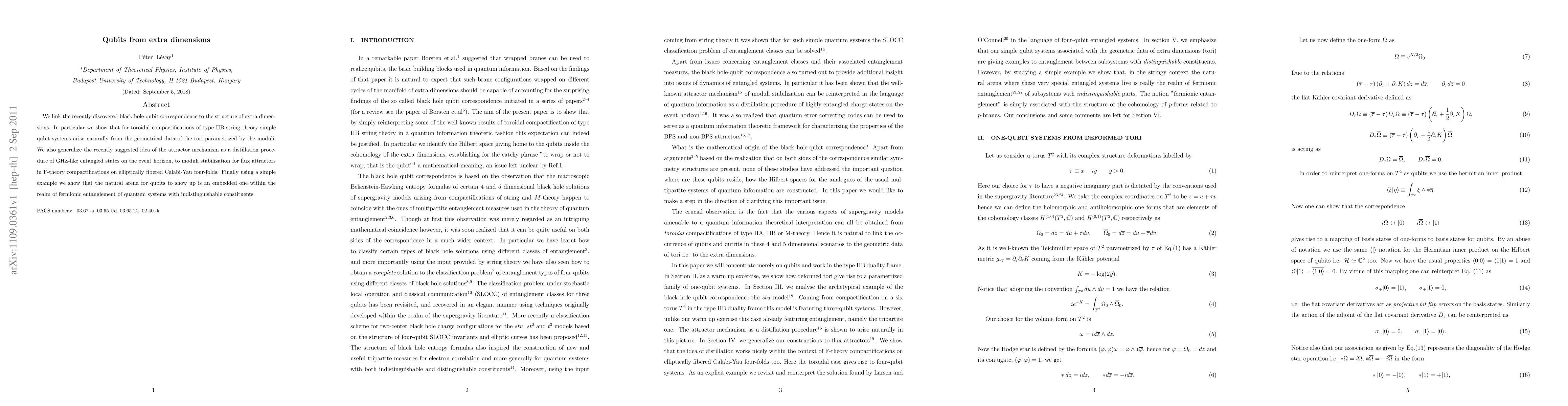 We link the recently discovered black hole-qubit correspondence to the structure of extra dimensions. In particular we show that for toroidal compactifications of type IIB string theory simple qubit systems arise naturally from the geometrical data of the tori parametrized by the moduli. We also generalize the recently suggested idea of the attractor mechanism as a distillation procedure of GHZ-like entangled states on the event horizon, to moduli stabilization for flux attractors in F-theory compactifications on elliptically fibered Calabi-Yau four-folds. Finally using a simple example we show that the natural arena for qubits to show up is an embedded one within the realm of fermionic entanglement of quantum systems with indistinguishable constituents.