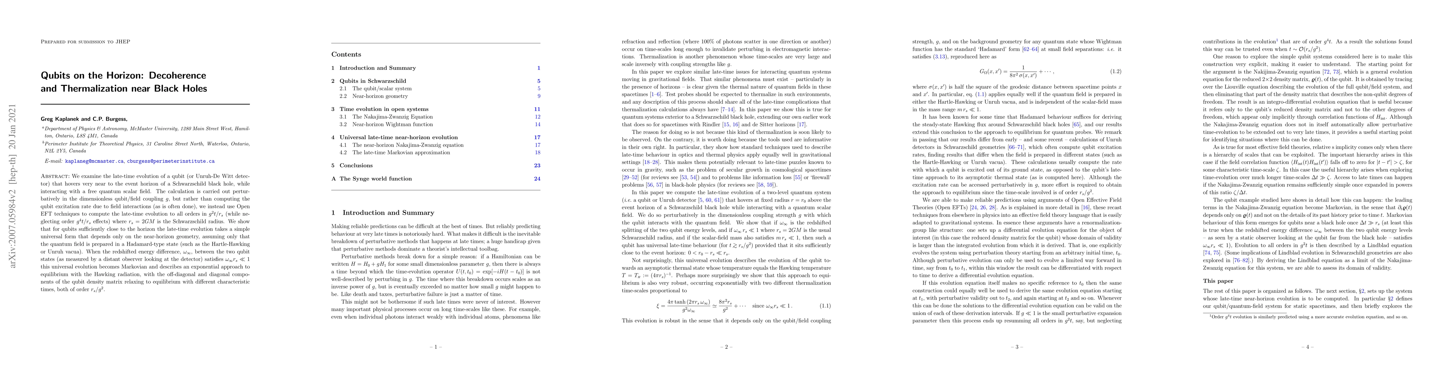 We examine the late-time evolution of a qubit (or Unruh-De Witt detector) that hovers very near to the event horizon of a Schwarzschild black hole, while interacting with a free quantum scalar field. The calculation is carried out perturbatively in the dimensionless qubit/field coupling $g$, but rather than computing the qubit excitation rate due to field interactions (as is often done), we instead use Open EFT techniques to compute the late-time evolution to all orders in $g^2 t/r_s$ (while neglecting order $g^4 t/r_s$ effects) where $r_s = 2GM$ is the Schwarzschild radius. We show that for qubits sufficiently close to the horizon the late-time evolution takes a simple universal form that depends only on the near-horizon geometry, assuming only that the quantum field is prepared in a Hadamard-type state (such as the Hartle-Hawking or Unruh vacua). When the redshifted energy difference, $\omega_\infty$, between the two qubit states (as measured by a distant observer looking at the detector) satisfies $\omega_\infty r_s \ll 1$ this universal evolution becomes Markovian and describes an exponential approach to equilibrium with the Hawking radiation, with the off-diagonal and diagonal components of the qubit density matrix relaxing to equilibrium with different characteristic times, both of order $r_s/g^2$.