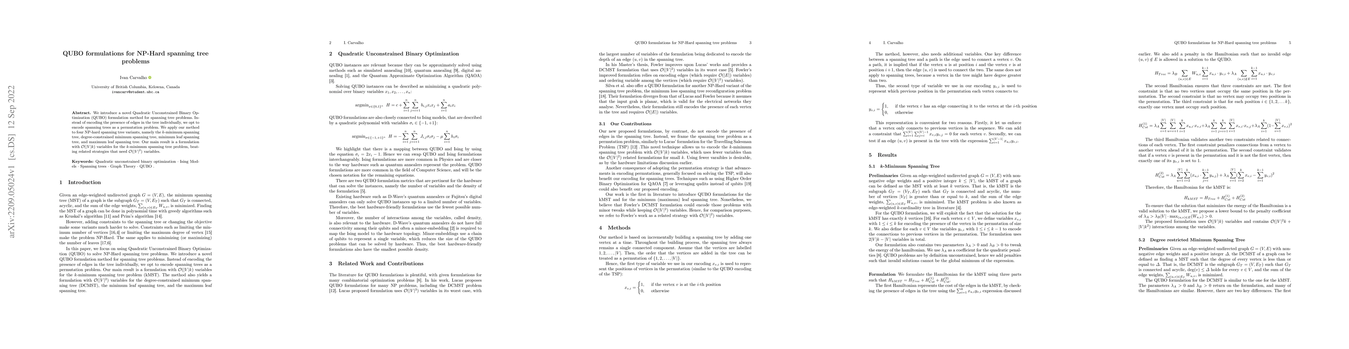 The paper presents novel QUBO formulations for k-minimum spanning tree, degree-constrained minimum spanning tree, minimum leaf spanning tree, and maximum leaf spanning tree, all with O(|V|^2) variables.