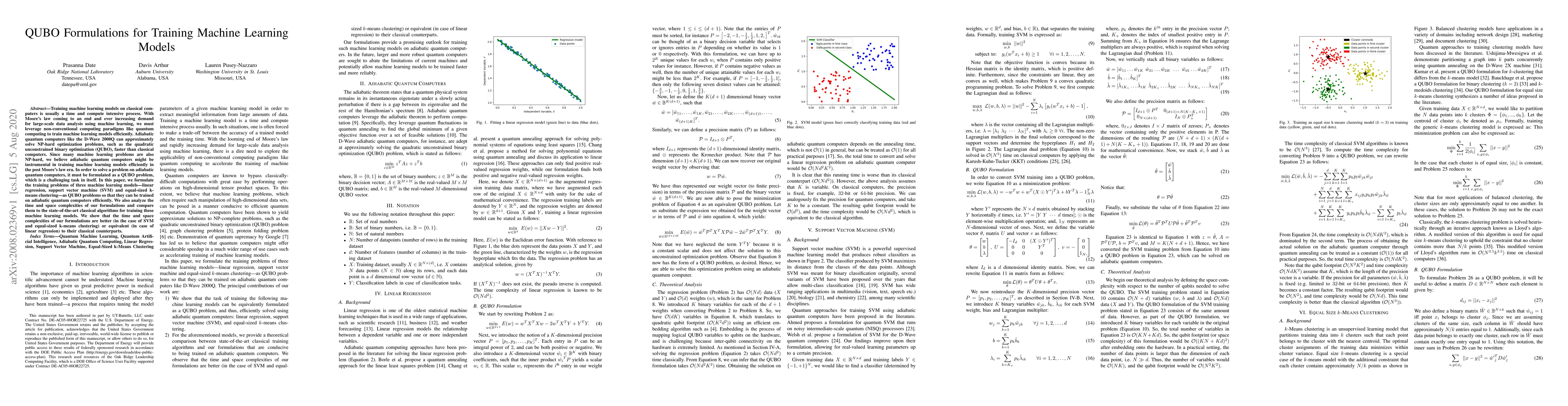 The paper proposes QUBO formulations for training machine learning models (linear regression, SVM, and equal-sized k-means clustering) to be solved on adiabatic quantum computers like D-Wave 2000Q.