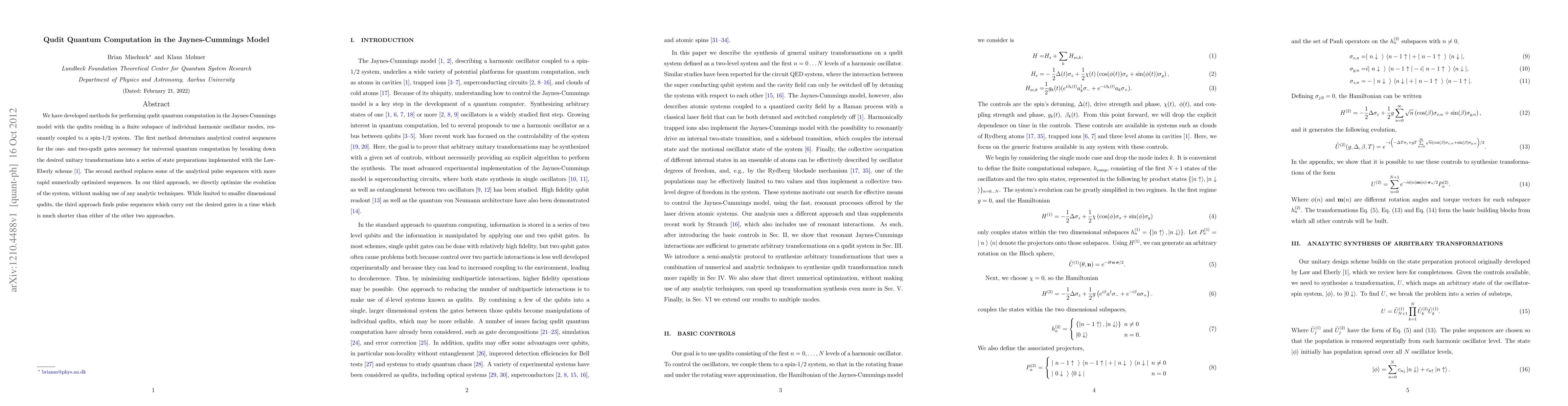 We have developed methods for performing qudit quantum computation in the Jaynes-Cummings model with the qudits residing in a finite subspace of individual harmonic oscillator modes, resonantly coupled to a spin-1/2 system. The first method determines analytical control sequences for the one- and two-qudit gates necessary for universal quantum computation by breaking down the desired unitary transformations into a series of state preparations implemented with the Law-Eberly scheme. The second method replaces some of the analytical pulse sequences with more rapid numerically optimized sequences. In our third approach, we directly optimize the evolution of the system, without making use of any analytic techniques. While limited to smaller dimensional qudits, the third approach finds pulse sequences which carry out the desired gates in a time which is much shorter than either of the other two approaches.
