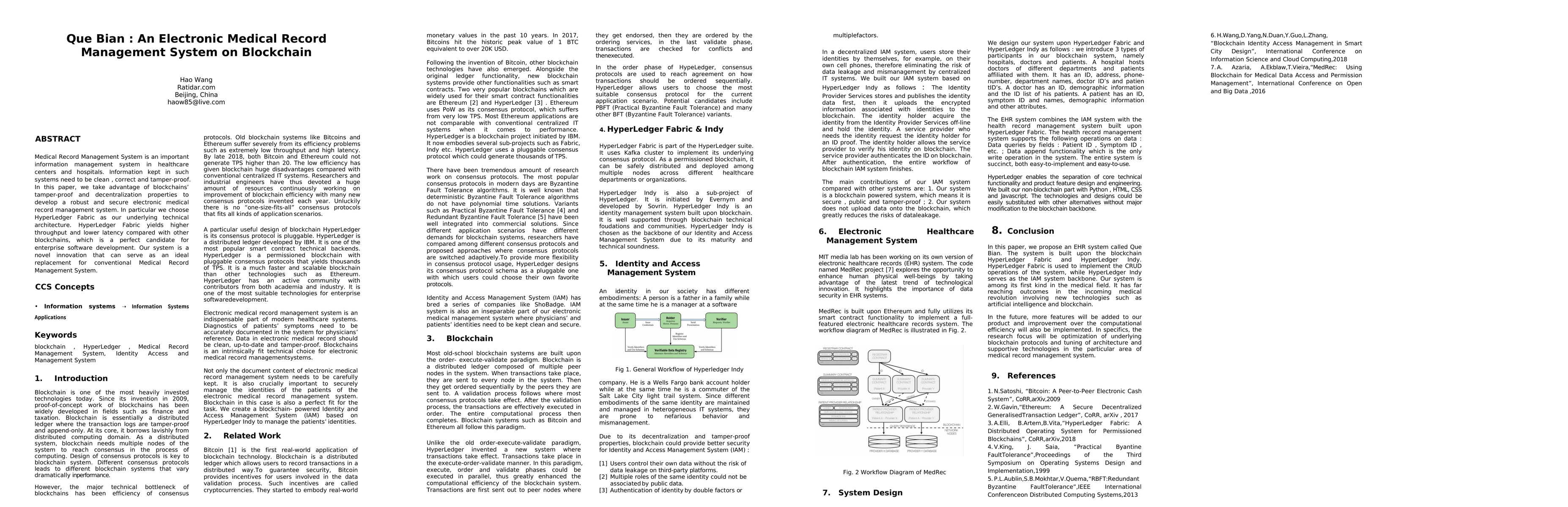This paper proposes Que Bian, a secure electronic medical record management system leveraging HyperLedger Fabric blockchain for its tamper-proof and decentralized properties, offering higher throughput and lower latency compared to other blockchains. It aims to replace conventional medical record systems with enhanced security and efficiency.