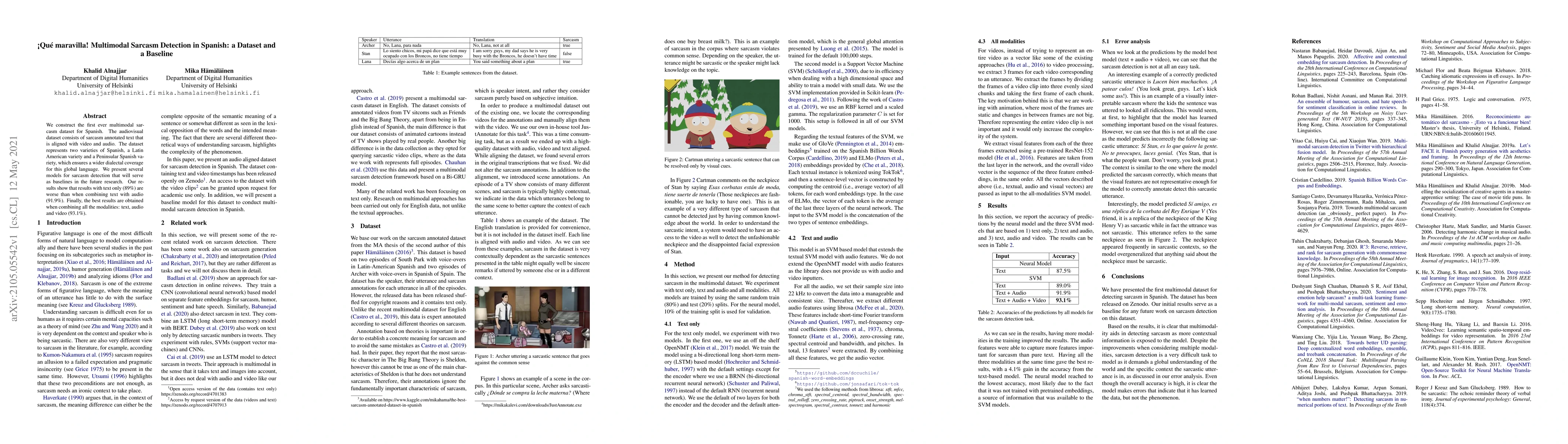 We construct the first ever multimodal sarcasm dataset for Spanish. The audiovisual dataset consists of sarcasm annotated text that is aligned with video and audio. The dataset represents two varieties of Spanish, a Latin American variety and a Peninsular Spanish variety, which ensures a wider dialectal coverage for this global language. We present several models for sarcasm detection that will serve as baselines in the future research. Our results show that results with text only (89%) are worse than when combining text with audio (91.9%). Finally, the best results are obtained when combining all the modalities: text, audio and video (93.1%).