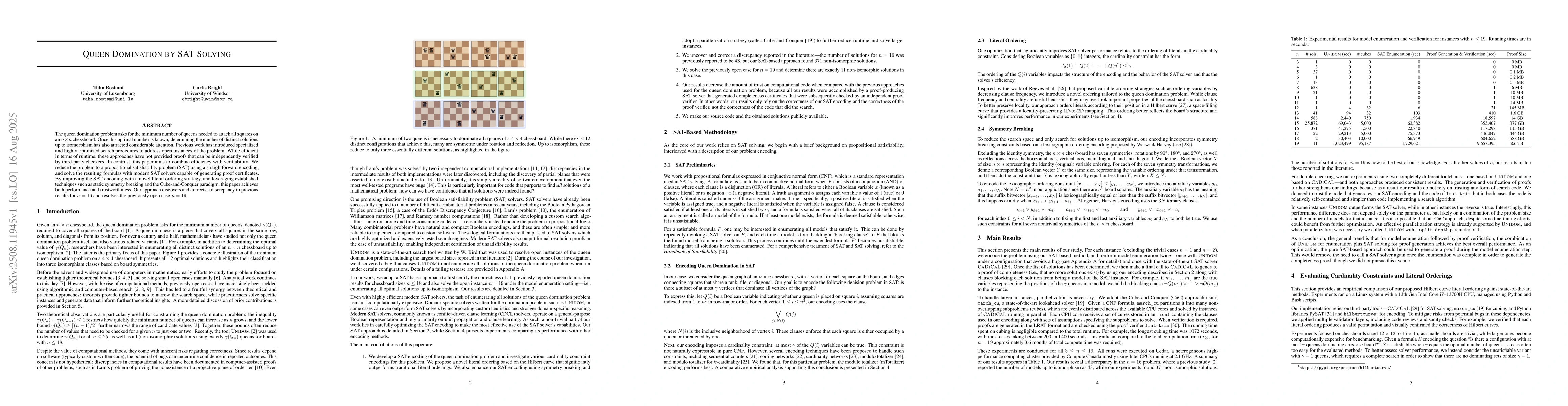 The queen domination problem asks for the minimum number of queens needed to attack all squares on an $n\times n$ chessboard. Once this optimal number is known, determining the number of distinct solutions up to isomorphism has also attracted considerable attention. Previous work has introduced specialized and highly optimized search procedures to address open instances of the problem. While efficient in terms of runtime, these approaches have not provided proofs that can be independently verified by third-party checkers. In contrast, this paper aims to combine efficiency with verifiability. We reduce the problem to a propositional satisfiability problem (SAT) using a straightforward encoding, and solve the resulting formulas with modern SAT solvers capable of generating proof certificates. By improving the SAT encoding with a novel literal ordering strategy, and leveraging established techniques such as static symmetry breaking and the Cube-and-Conquer paradigm, this paper achieves both performance and trustworthiness. Our approach discovers and corrects a discrepancy in previous results for $n=16$ and resolves the previously open case $n=19$.