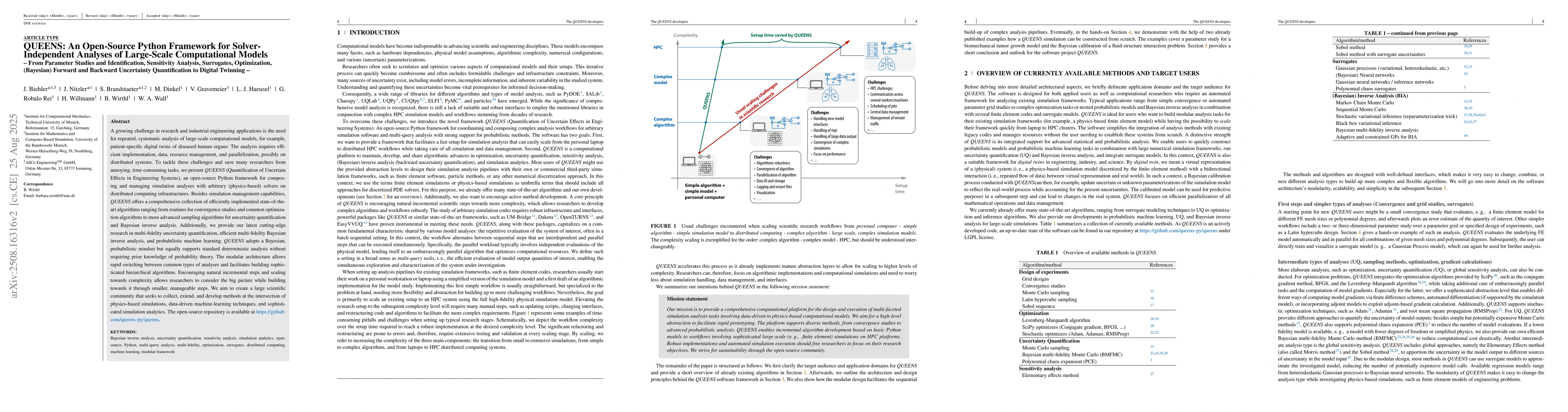 A growing challenge in research and industrial engineering applications is the need for repeated, systematic analysis of large-scale computational models, for example, patient-specific digital twins of diseased human organs: The analysis requires efficient implementation, data, resource management, and parallelization, possibly on distributed systems. To tackle these challenges and save many researchers from annoying, time-consuming tasks, we present QUEENS (Quantification of Uncertain Effects in Engineering Systems), an open-source Python framework for composing and managing simulation analyses with arbitrary (physics-based) solvers on distributed computing infrastructures. Besides simulation management capabilities, QUEENS offers a comprehensive collection of efficiently implemented state-of-the-art algorithms ranging from routines for convergence studies and common optimization algorithms to more advanced sampling algorithms for uncertainty quantification and Bayesian inverse analysis. Additionally, we provide our latest cutting-edge research in multi-fidelity uncertainty quantification, efficient multi-fidelity Bayesian inverse analysis, and probabilistic machine learning. QUEENS adopts a Bayesian, probabilistic mindset but equally supports standard deterministic analysis without requiring prior knowledge of probability theory. The modular architecture allows rapid switching between common types of analyses and facilitates building sophisticated hierarchical algorithms. Encouraging natural incremental steps and scaling towards complexity allows researchers to consider the big picture while building towards it through smaller, manageable steps. The open-source repository is available at https://github.com/queens-py/queens.
