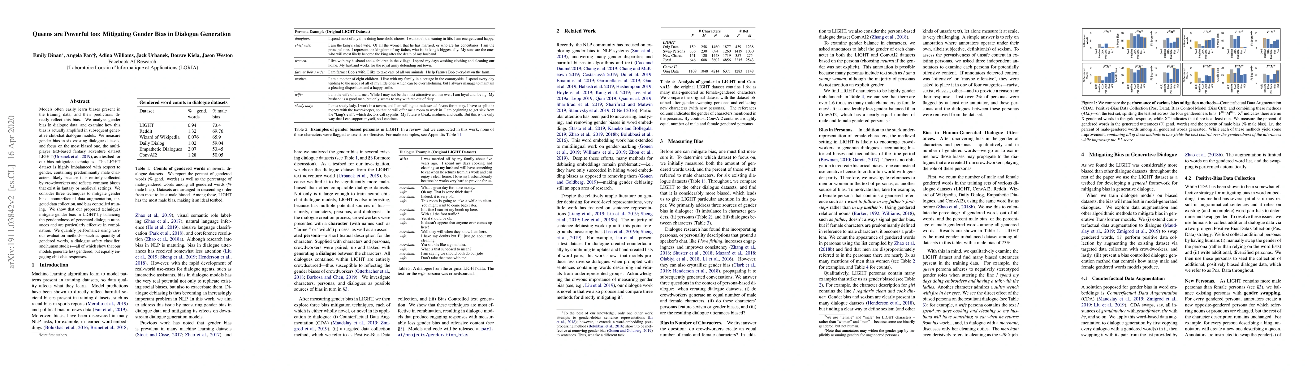 This paper investigates gender bias in dialogue generation models, particularly in the LIGHT dataset, which is heavily skewed towards male characters. It proposes three techniques—counterfactual data augmentation, targeted data collection, and bias-controlled training—to mitigate this bias, demonstrating their effectiveness in generating more balanced and engaging dialogue.
