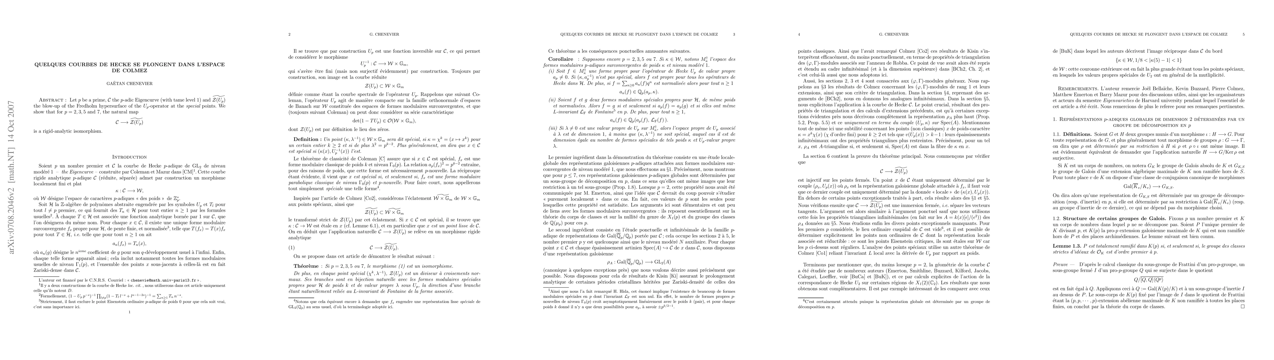 Let p be a prime, C the p-adic Eigencurve (with tame level 1) and Z the blow-up of the Fredholm hypersurface of the U_p - operator at the special points. We show that for p = 2, 3, 5 and 7, the natural map C -> Z is a rigid-analytic isomorphism.