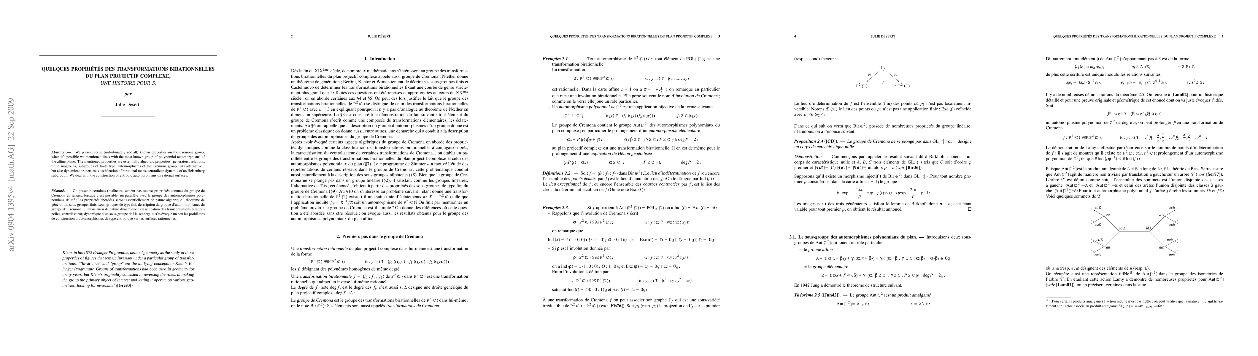 We present some (unfortunately not all) known properties on the Cremona group; when it's possible we mentioned links with the most known group of polynomial automorphisms of the affine plane. The mentioned properties are essentially algebraic properties: generators, relations, finite subgroups, subgroups of finite type, automorphisms of the Cremona group, Tits alternative... but also dynamical properties: classification of birational maps, centralizer, dynamic of an Heisenberg subgroup... We deal with the construction of entropic automorphisms on rational surfaces.