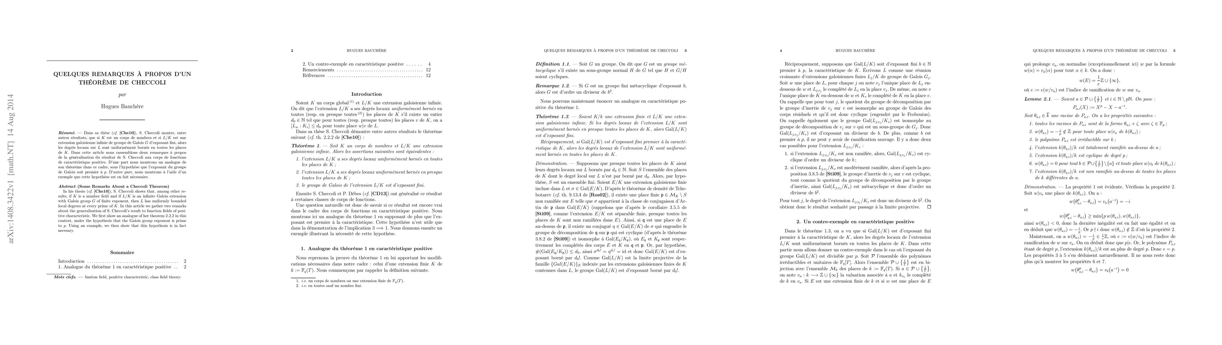 In his thesis, S. Checcoli shows that, among other results, if $K$ is a number field and if $L/K$ is an infinite Galois extension with Galois group $G$ of finite exponent, then $L$ has uniformly bounded local degrees at every prime of $K$. In this article we gather two remarks about the generalisation of S. Checcoli's result to function fields of positive characteristic. We first show an analogue of her theorem $2.2.2$ in this context, under the hypothesis that the Galois group exponent is prime to $p$. Using an example, we then show that this hypothesis is in fact necesary.---Dans sa th\`ese, S. Checcoli montre, entre autres r\'esultats, que si K est un corps de nombres et si L=K est une extension galoisienne in finie de groupe de Galois G d'exposant fini, alors les degr\'es locaux sur L sont uniform\'ement born\'es en toutes les places de K. Dans cette article nous rassemblons deux remarques \`a propos de la g\'en\'eralisation du r\'esultat de S. Checcoli aux corps de fonctions de caract\'eristique positive. D'une part nous montrons un analogue de son th\'eor\`eme dans ce cadre, sous l'hypoth\`ese que l'exposant du groupe de Galois soit premier \`a p. D'autre part, nous montrons \`a l'aide d'un exemple que cette hypoth\`ese est en fait n\'ecessaire.
