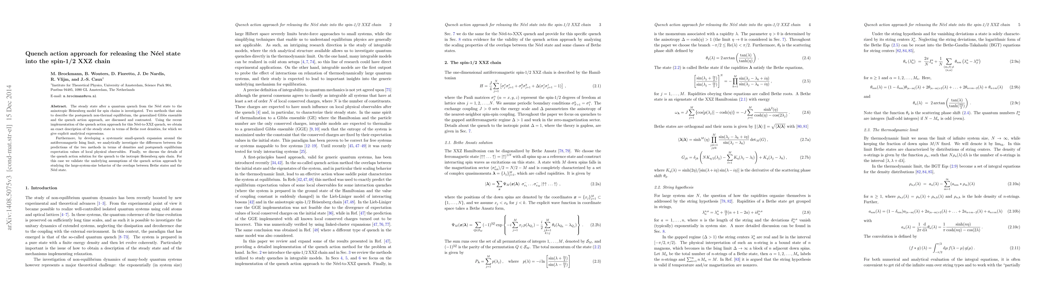 This paper investigates the steady state after a quantum quench from the N\'eel state to the anisotropic Heisenberg spin-1/2 XXZ chain, comparing the generalized Gibbs ensemble and the quench action approach. It provides an exact description of the postquench state using the quench action approach and validates the method's assumptions through large-system-size behavior analysis.