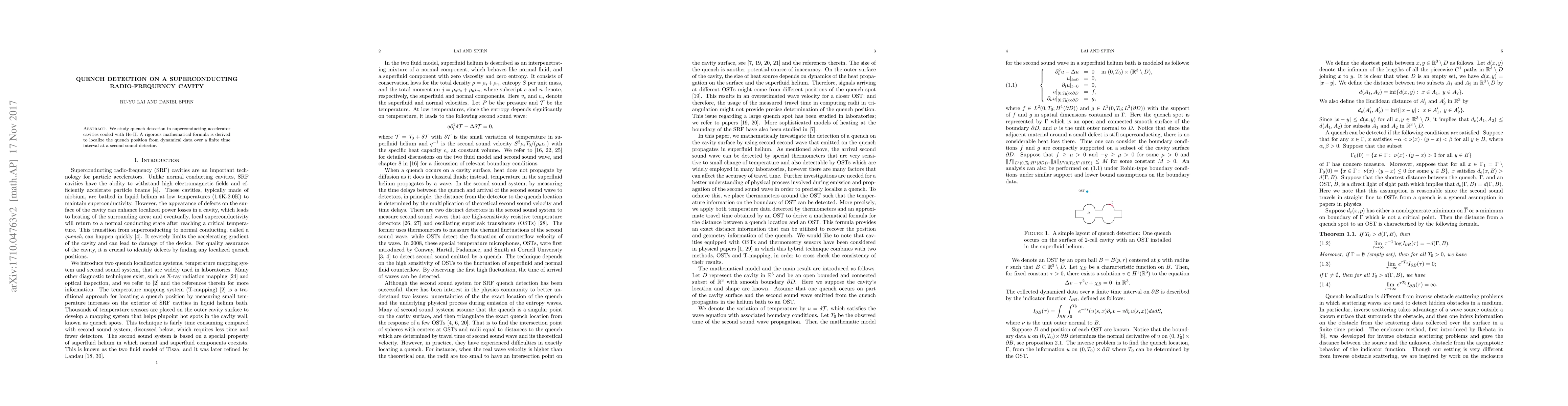 Summary: This paper develops a mathematical formula to precisely locate quench events in superconducting radio-frequency cavities cooled with He-II, utilizing second sound detection data over a finite time interval. The method aims to enhance the reliability of quench detection in accelerator applications.