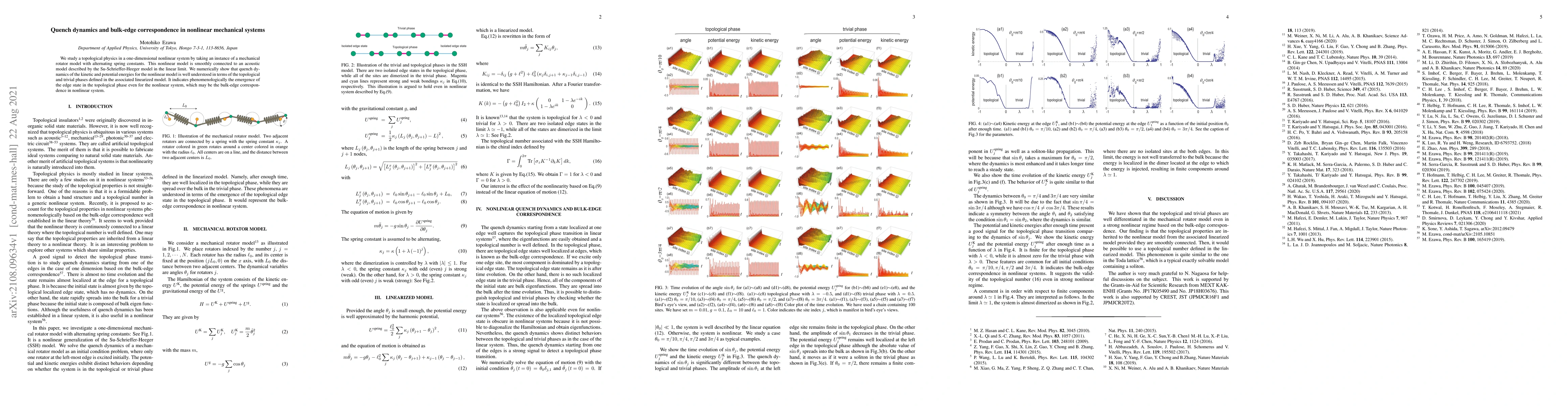 This paper explores topological physics in a nonlinear mechanical rotator model with alternating spring constants, demonstrating that quench dynamics reveal a bulk-edge correspondence akin to that in linear systems. The findings suggest the emergence of edge states in the topological phase even in nonlinear systems.