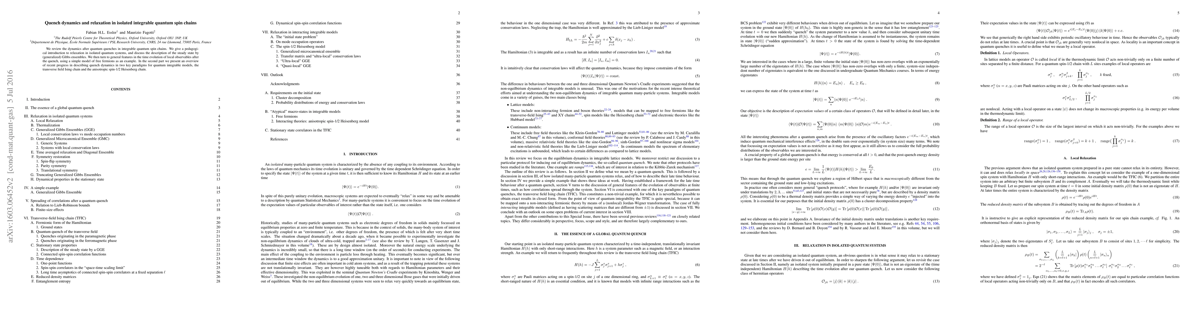 This paper reviews the dynamics and relaxation following quantum quenches in integrable quantum spin chains, introducing key concepts and generalized Gibbs ensembles. It also discusses recent advancements in understanding quench dynamics in the transverse field Ising chain and the anisotropic spin-1/2 Heisenberg chain.