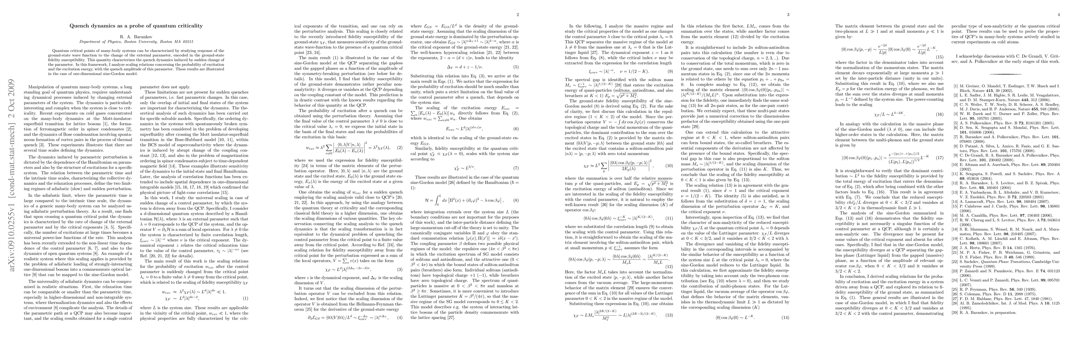 Quantum critical points of many-body systems can be characterized by studying response of the ground-state wave function to the change of the external parameter, encoded in the ground-state fidelity susceptibility. This quantity characterizes the quench dynamics induced by sudden change of the parameter. In this framework, I analyze scaling relations concerning the probability of excitation and the excitation energy, with the quench amplitude of this parameter. These results are illustrated in the case of one-dimensional sine-Gordon model.