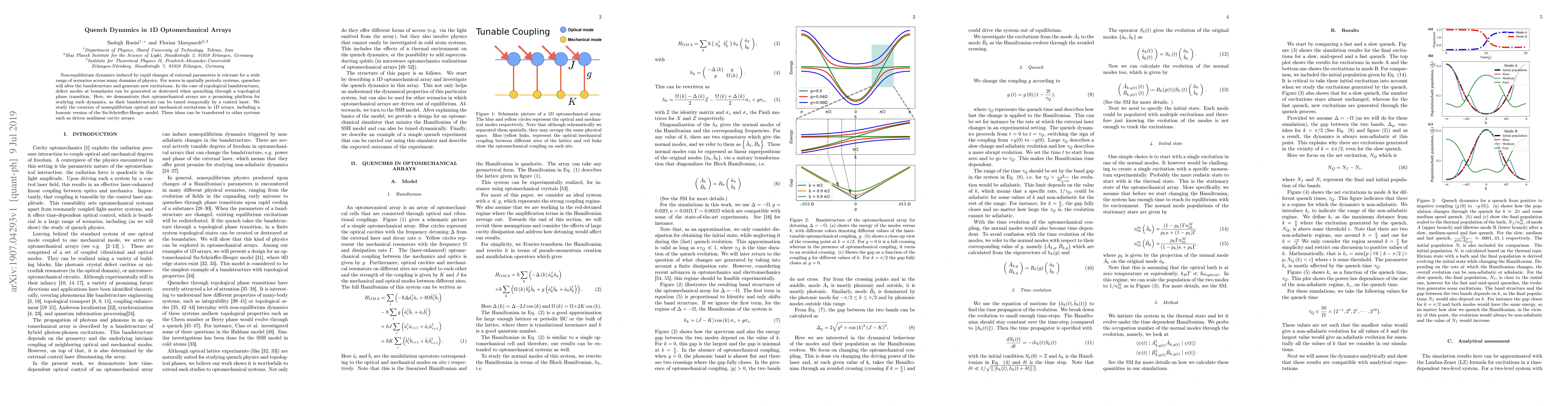 This paper explores the quench dynamics in 1D optomechanical arrays, demonstrating how rapid changes in external parameters can alter bandstructures and generate new excitations, particularly in topological systems. The study highlights optomechanical arrays as a promising platform for investigating these dynamics, with potential applications to other driven nonlinear cavity arrays.