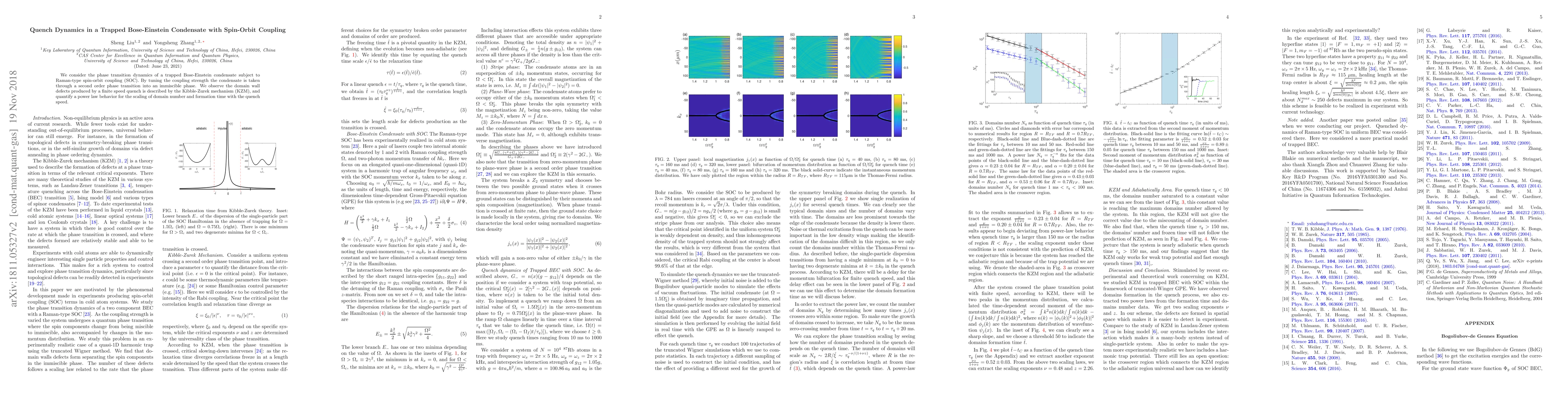 This paper investigates the phase transition dynamics in a Bose-Einstein condensate with Raman-type spin-orbit coupling, observing domain wall defects during a finite speed quench. The study quantifies the Kibble-Zurek mechanism's power law behavior for domain number and formation time scaling with quench speed.