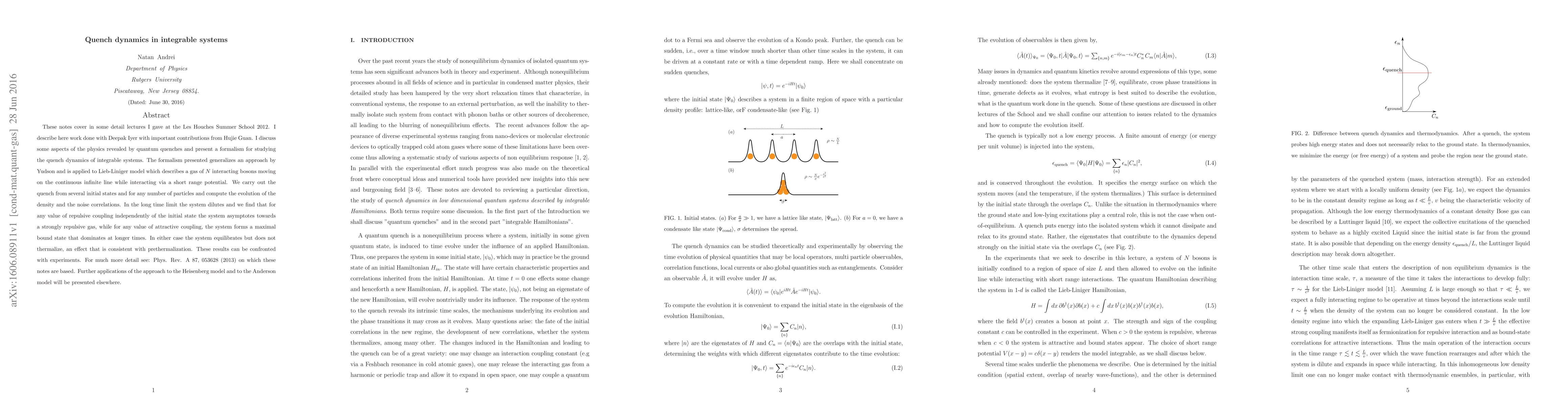 These notes cover in some detail lectures I gave at the Les Houches Summer School 2012. I describe here work done with Deepak Iyer with important contributions from Hujie Guan. I discuss some aspects of the physics revealed by quantum quenches and present a formalism for studying the quench dynamics of integrable systems. The formalism presented generalizes an approach by Yudson and is applied to Lieb-Liniger model which describes a gas of $N$ interacting bosons moving on the continuous infinite line while interacting via a short range potential. We carry out the quench from several initial states and for any number of particles and compute the evolution of the density and the noise correlations. In the long time limit the system dilutes and we find that for any value of repulsive coupling independently of the initial state the system asymptotes towards astrongly repulsive gas, while for any value of attractive coupling, the system forms a maximal bound state that dominates at longer times. In either case the system equilibrates but does not thermalize, an effect that is consistent with prethermalization. These results can be confronted with experiments. For much more detail see: Phys. Rev. A 87, 053628 (2013) on which these notes are based. Further applications of the approach to the Heisenberg model and to the Anderson model will be presented elsewhere.
