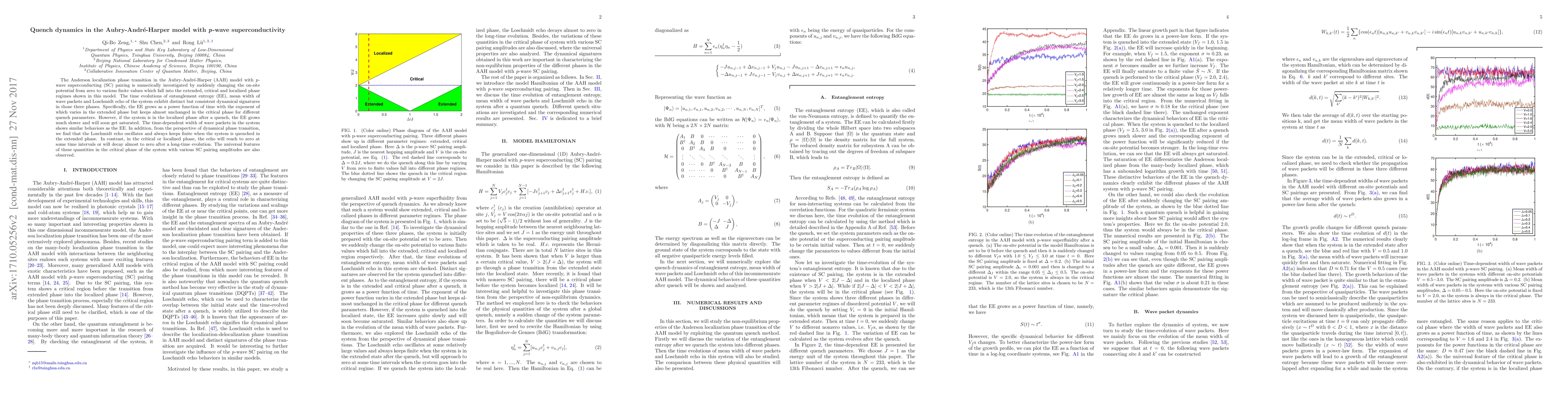 The Aubry-André-Harper model with p-wave superconductivity shows distinct dynamical signatures after a quench, including growing entanglement entropy and Loschmidt echo behaviors that vary between extended, critical, and localized phases.