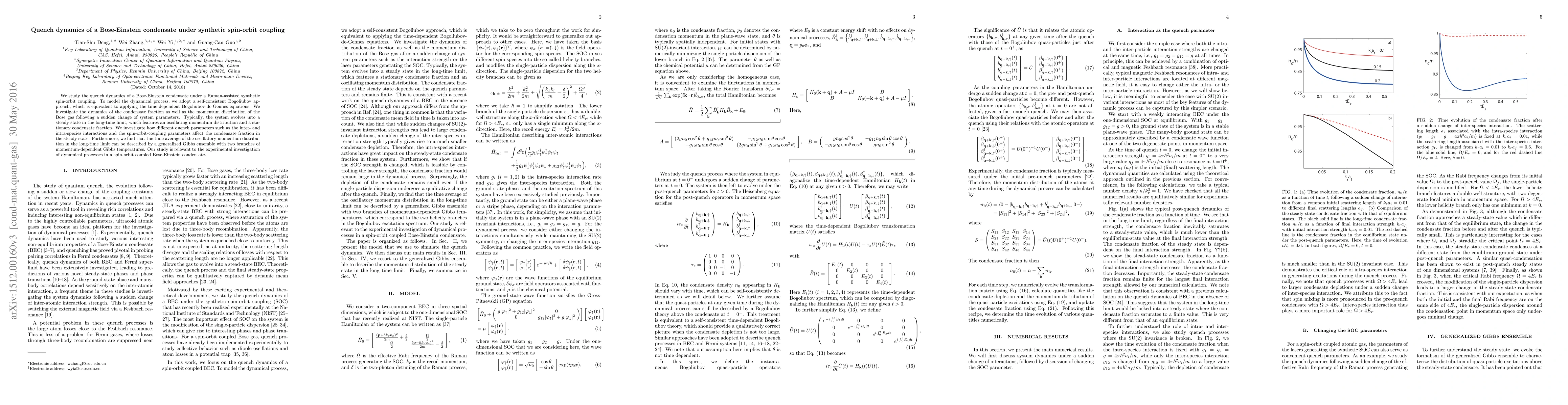 This paper investigates the quench dynamics of a Bose-Einstein condensate under synthetic spin-orbit coupling using a self-consistent Bogoliubov approach. It finds that the system evolves into a steady state with an oscillating momentum distribution and a quench-parameter-dependent condensate fraction, described by a generalized Gibbs ensemble.