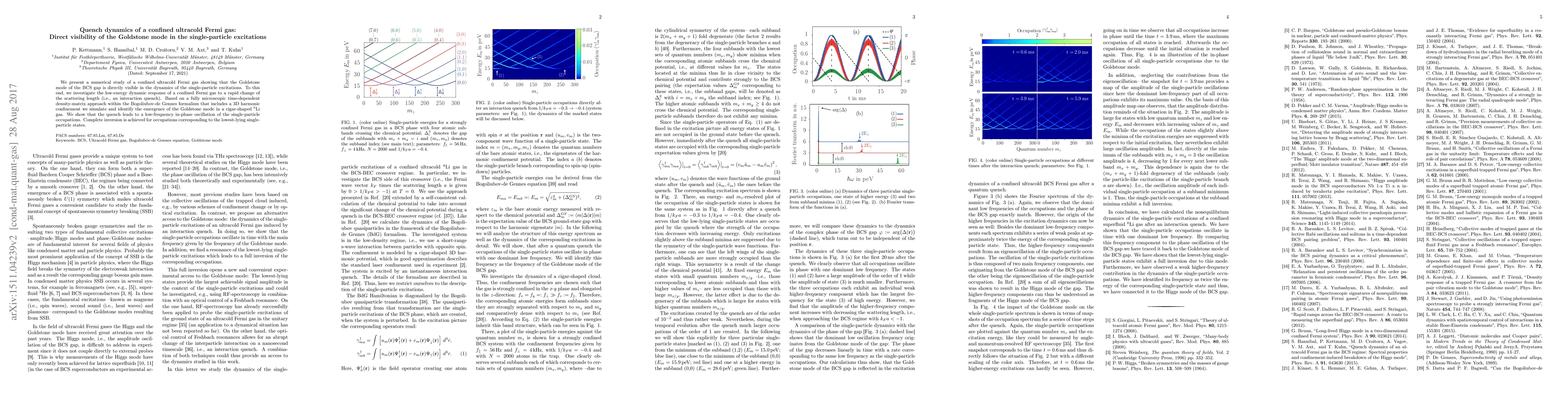 We present a numerical study of a confined ultracold Fermi gas showing that the Goldstone mode of the BCS gap is directly visible in the dynamics of the single-particle excitations. To this end, we investigate the low-energy dynamic response of a confined Fermi gas to a rapid change of the scattering length (i.e., an interaction quench). Based on a fully microscopic time-dependent density-matrix approach within the Bogoliubov-de Gennes formalism that includes a 3D harmonic confinement we simulate and identify the emergence of the Goldstone mode in a cigar-shaped $^6$Li gas. We show that the quench leads to a low-frequency in-phase oscillation of the single-particle occupations. Complete inversion is achieved for occupations corresponding to the lowest-lying single-particle states.