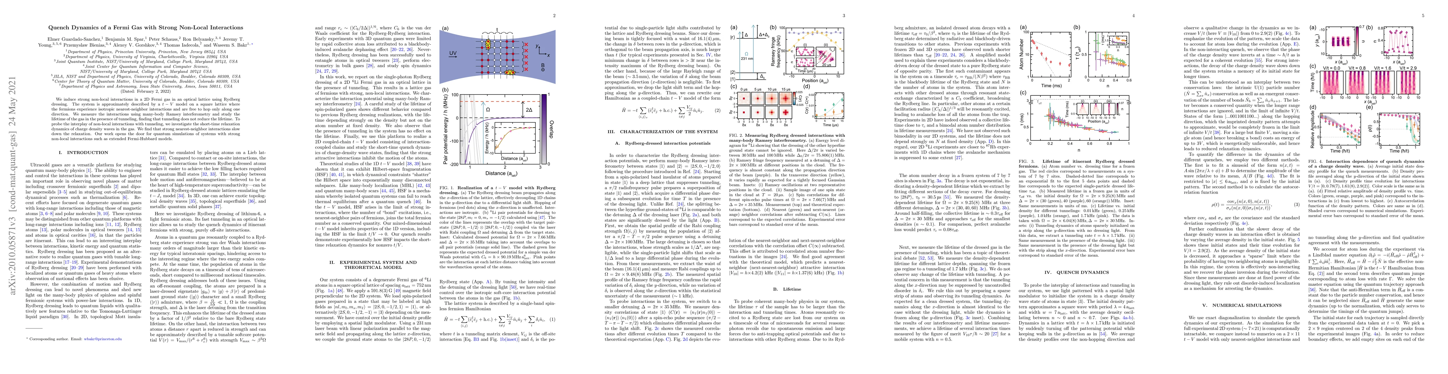 This study investigates the quench dynamics of a 2D Fermi gas with strong non-local interactions induced via Rydberg dressing, finding that tunneling does not reduce the gas lifetime. Strong nearest-neighbor interactions slow down the relaxation of charge density waves, paving the way for quantum simulations of extended Fermi-Hubbard models.
