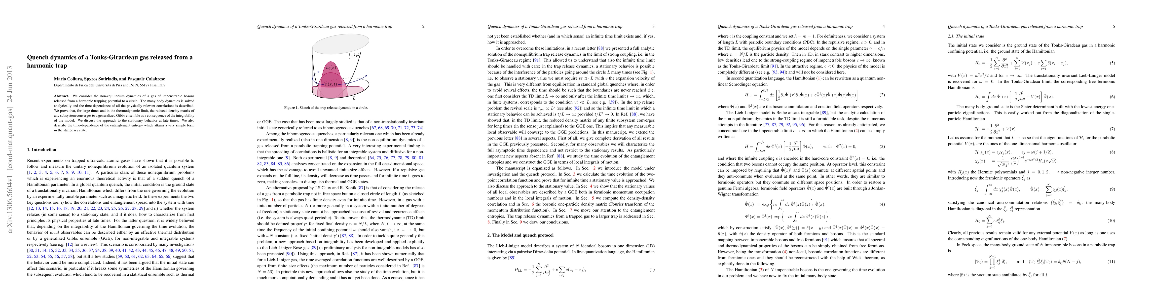 We consider the non-equilibrium dynamics of a gas of impenetrable bosons released from a harmonic trapping potential to a circle. The many body dynamics is solved analytically and the time dependence of all the physically relevant correlations is described. We prove that, for large times and in the thermodynamic limit, the reduced density matrix of any subsystem converges to a generalized Gibbs ensemble as a consequence of the integrability of the model. We discuss the approach to the stationary behavior at late times. We also describe the time-dependence of the entanglement entropy which attains a very simple form in the stationary state.
