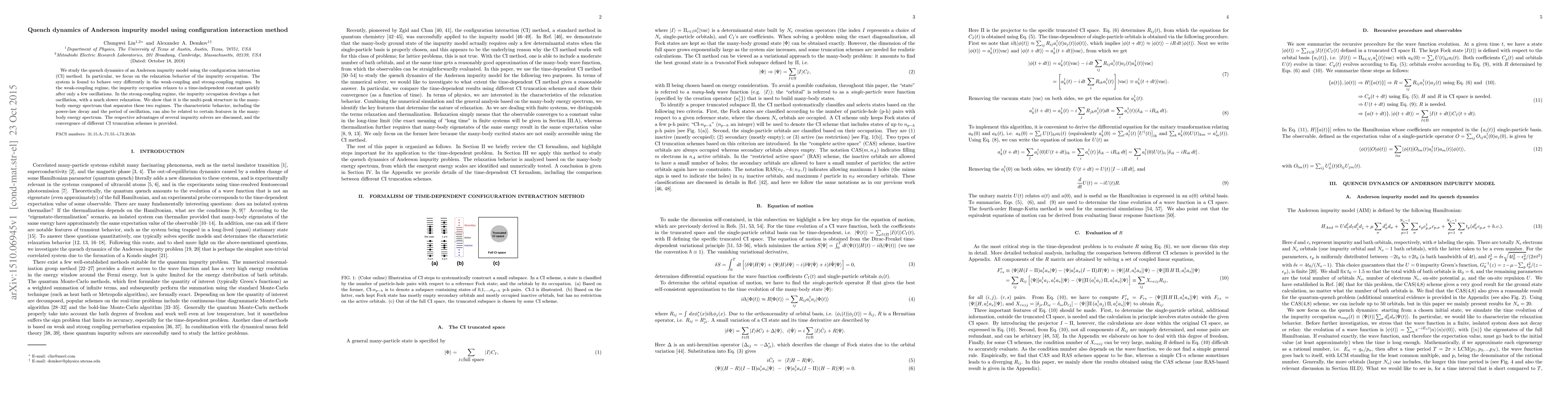 This paper investigates the quench dynamics of an Anderson impurity model using the configuration interaction method, revealing distinct relaxation behaviors in weak-coupling and strong-coupling regimes. The study finds rapid oscillations and relaxation in the weak-coupling regime, while strong-coupling results in slower relaxation and persistent oscillations, attributed to the multi-peak structure in the many-body energy spectrum.