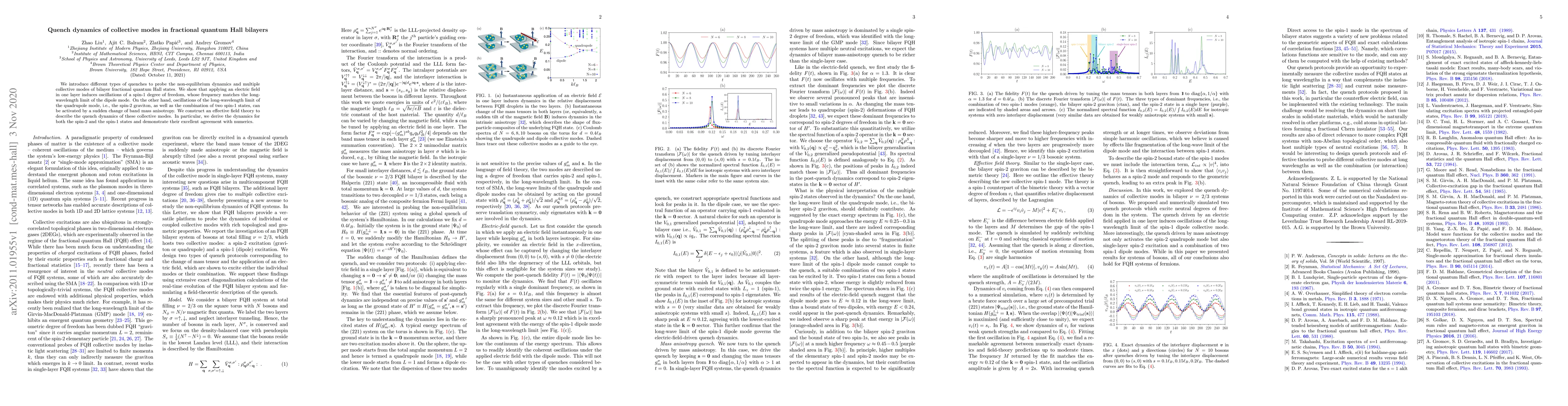 This paper investigates the dynamics of collective modes in fractional quantum Hall bilayers under various quenches, revealing oscillations in spin-1 and spin-2 degrees of freedom. An electric field induces spin-1 oscillations, while changes in band mass anisotropy activate spin-2 and combined spin-1 oscillations, with an effective field theory developed to describe these dynamics.