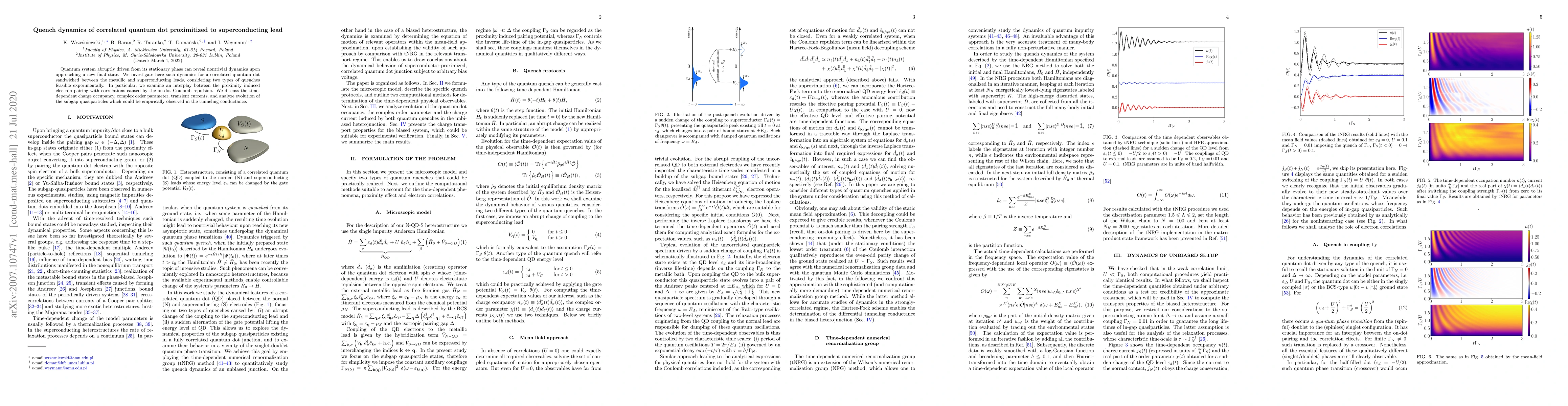 This paper explores the quench dynamics of a correlated quantum dot placed between a metallic and a superconducting lead, focusing on the interplay between superconductivity-induced electron pairing and on-dot Coulomb interactions. It analyzes the time-dependent charge occupancy, transient currents, and evolution of subgap quasiparticles, which can be observed in tunneling conductance.