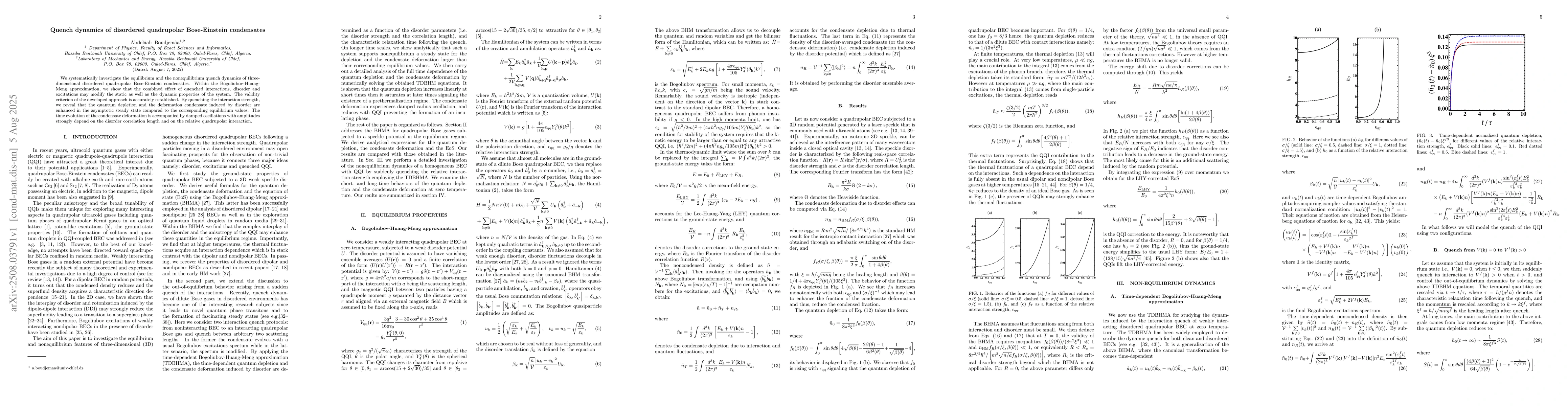 We systematically investigate the equilibrium and the nonequilibrium quench dynamics of three-dimensional disordered quadrupolar Bose-Einstein condensates. Within the Bogoliubov-Huang-Meng approximation, we show that the combined effect of quenched interactions, disorder and excitations may modify the static as well as the dynamic properties of the system. The validity criterion of the developed approach is accurately established. By quenching the interaction strength, we reveal that the quantum depletion and the deformation condensate induced by disorder are enhanced in the asymptotic steady state compared to the corresponding equilibrium values. The time evolution of the condensate deformation is accompanied by damped oscillations with amplitudes strongly depend on the disorder correlation length and on the relative quadrupolar interaction.