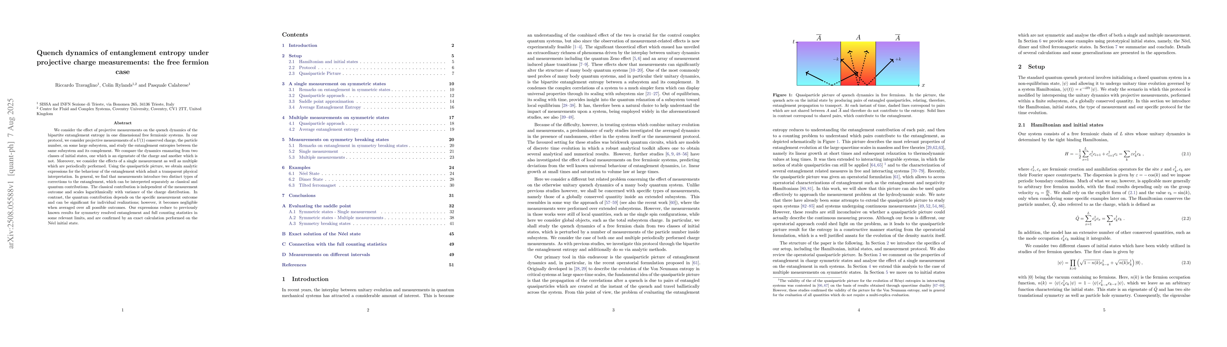 We consider the effect of projective measurements on the quench dynamics of the bipartite entanglement entropy in one dimensional free fermionic systems. In our protocol, we consider projective measurements of a $U(1)$ conserved charge, the particle number, on some large subsystem, and study the entanglement entropies between the same subsystem and its complement. We compare the dynamics emanating from two classes of initial states, one which is an eigenstate of the charge and another which is not. Moreover, we consider the effects of a single measurement as well as multiple which are periodically performed. Using the quasiparticle picture, we obtain analytic expressions for the behaviour of the entanglement which admit a transparent physical interpretation. In general, we find that measurements introduce two distinct types of corrections to the entanglement, which can be interpreted separately as classical and quantum contributions. The classical contribution is independent of the measurement outcome and scales logarithmically with variance of the charge distribution. In contrast, the quantum contribution depends on the specific measurement outcome and can be significant for individual realizations; however, it becomes negligible when averaged over all possible outcomes. Our expressions reduce to previously known results for symmetry resolved entanglement and full counting statistics in some relevant limits, and are confirmed by an exact calculation performed on the N\'eel initial state.