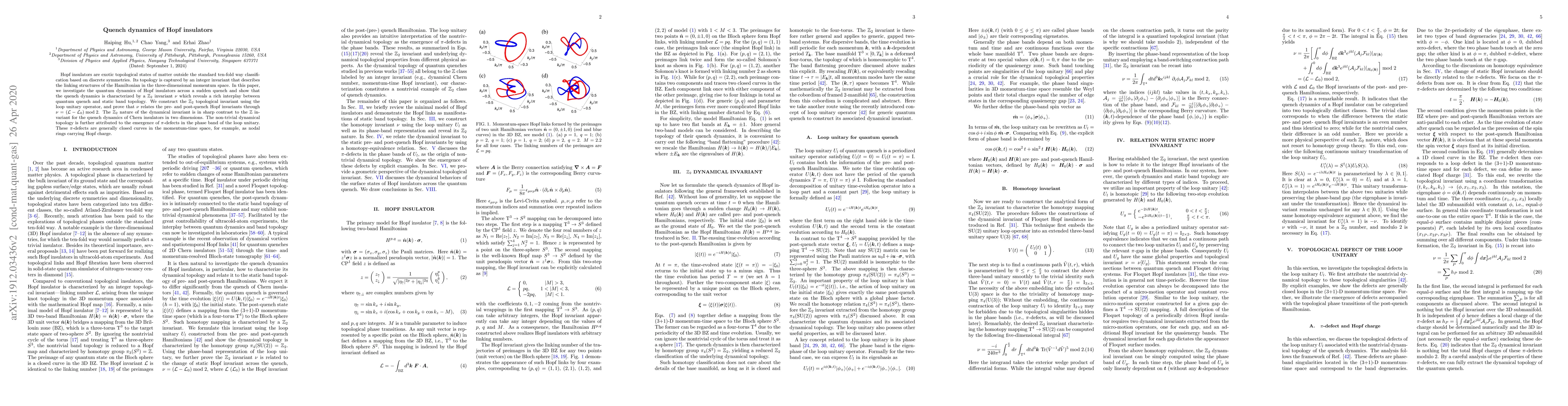 This paper explores the quantum dynamics of Hopf insulators following a sudden quench, revealing a $\mathbb{Z}_2$ invariant $\nu$ that connects pre- and post-quench Hopf invariants, contrasting with the $\mathbb{Z}$ invariant in Chern insulators. The non-trivial dynamical topology arises due to $\pi$-defects, such as nodal rings, in the phase band of the loop unitary.