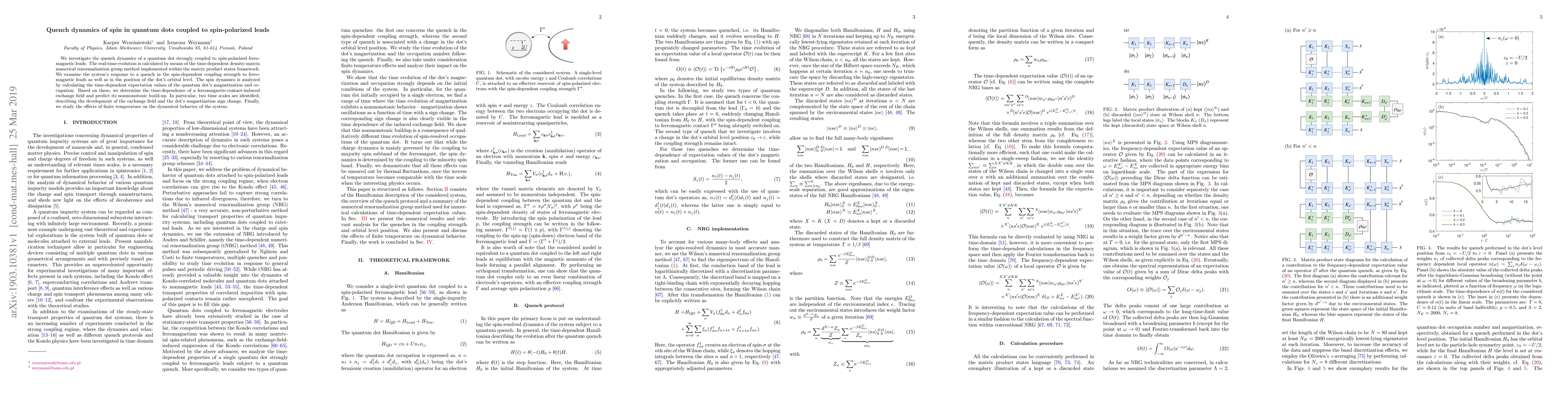 This paper investigates the quench dynamics of a quantum dot connected to spin-polarized ferromagnetic leads, using the time-dependent density-matrix numerical renormalization group method. It identifies two time scales for the development of an exchange field and magnetization sign change, and examines the effects of finite temperature on the system's dynamics.