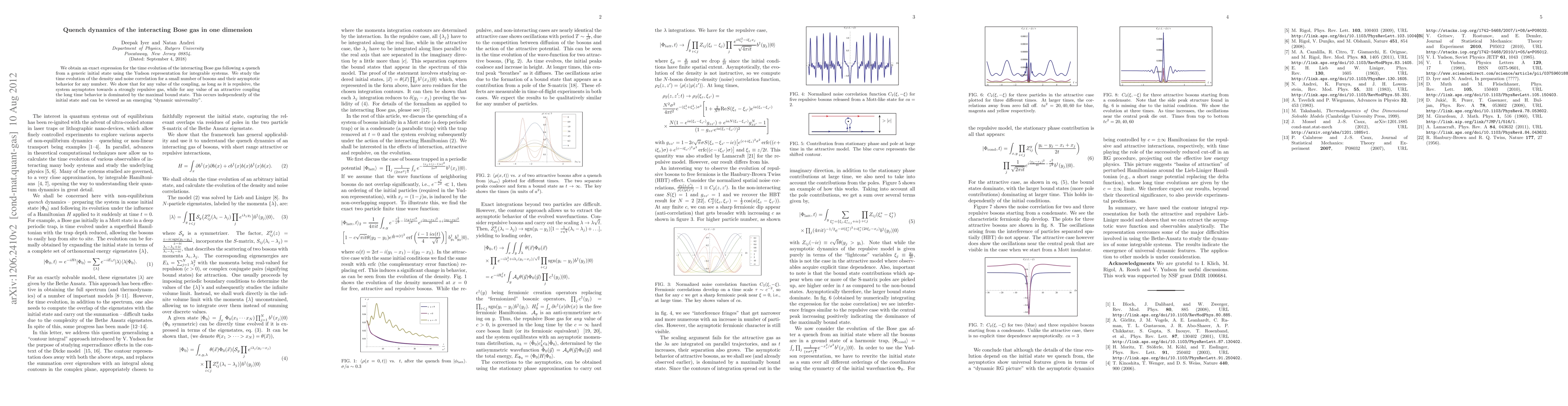 The paper provides an exact expression for the quench dynamics of a one-dimensional interacting Bose gas, revealing that repulsive interactions lead to a strongly repulsive gas asymptotic behavior, while attractive interactions result in maximal bound state dominance, showcasing dynamic universality regardless of the initial state.