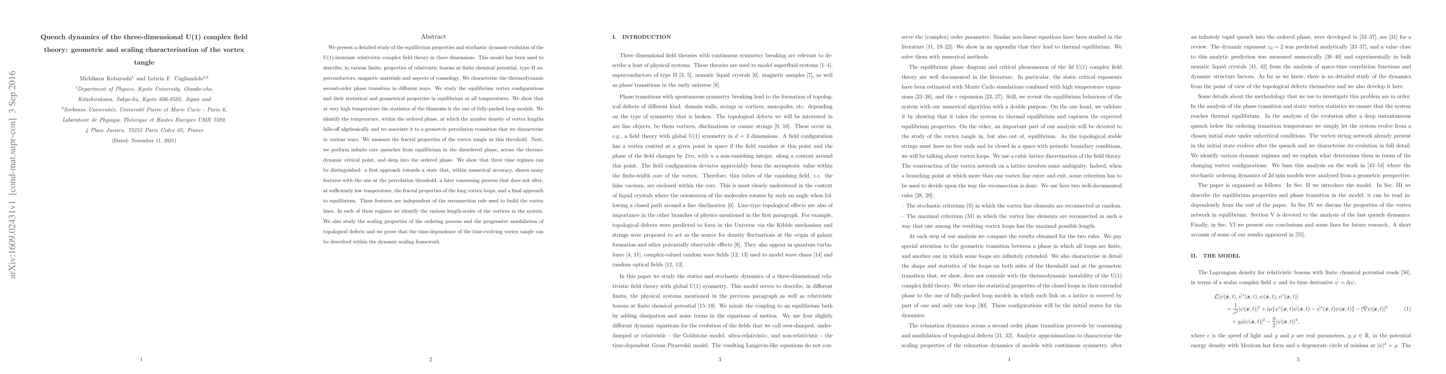 We present a detailed study of the equilibrium properties and stochastic dynamic evolution of the U(1)-invariant relativistic complex field theory in three dimensions. This model has been used to describe, in various limits, properties of relativistic bosons at finite chemical potential, type II su- perconductors, magnetic materials and aspects of cosmology. We characterise the thermodynamic second-order phase transition in different ways. We study the equilibrium vortex configurations and their statistical and geometrical properties in equilibrium at all temperatures. We show that at very high temperature the statistics of the filaments is the one of fully-packed loop models. We identify the temperature, within the ordered phase, at which the number density of vortex lengths falls-off algebraically and we associate it to a geometric percolation transition that we characterise in various ways. We measure the fractal properties of the vortex tangle at this threshold. Next, we perform infinite rate quenches from equilibrium in the disordered phase, across the thermo- dynamic critical point, and deep into the ordered phase. We show that three time regimes can be distinguished: a first approach towards a state that, within numerical accuracy, shares many features with the one at the percolation threshold, a later coarsening process that does not alter, at sufficiently low temperature, the fractal properties of the long vortex loops, and a final approach to equilibrium. These features are independent of the reconnection rule used to build the vortex lines. In each of these regimes we identify the various length-scales of the vortices in the system. We also study the scaling properties of the ordering process and the progressive annihilation of topological defects and we prove that the time-dependence of the time-evolving vortex tangle can be described within the dynamic scaling framework.